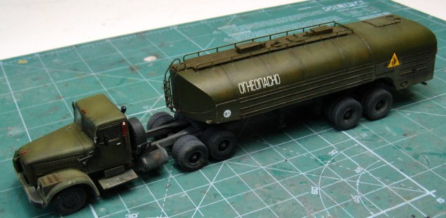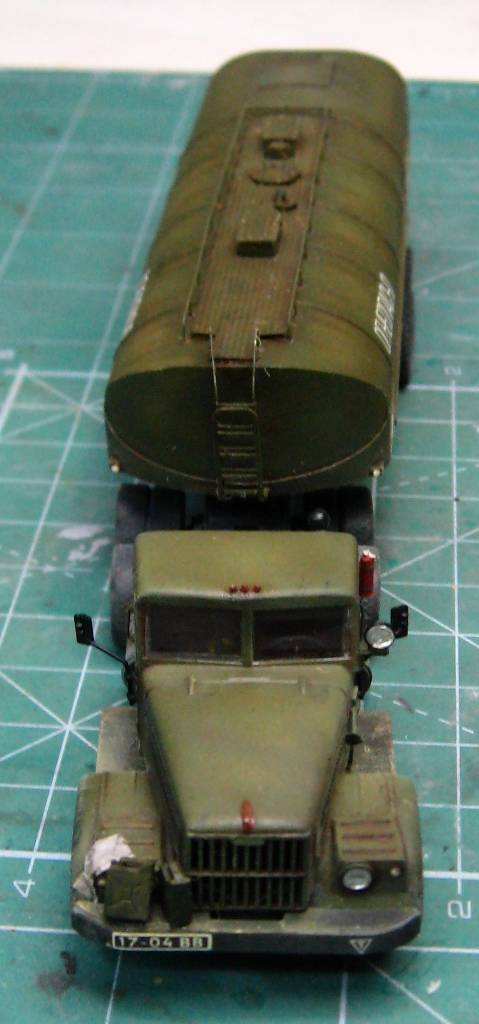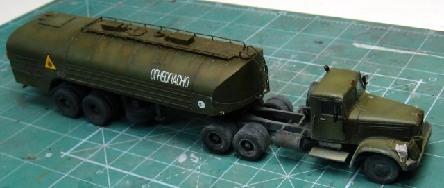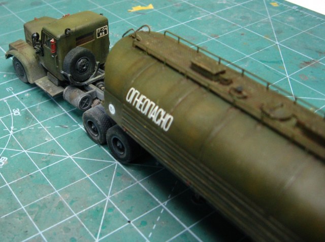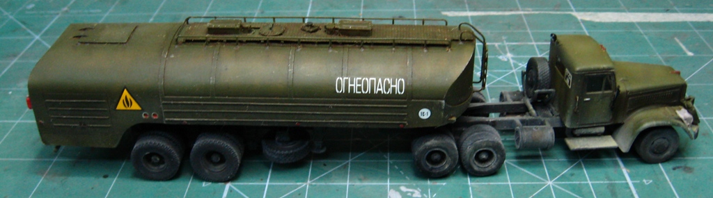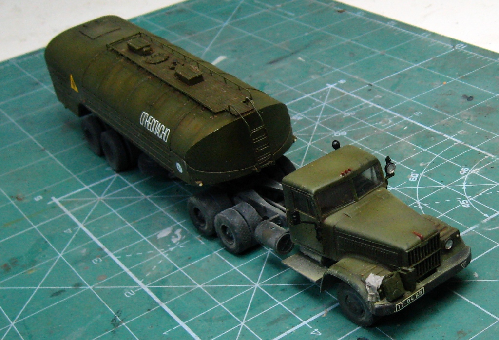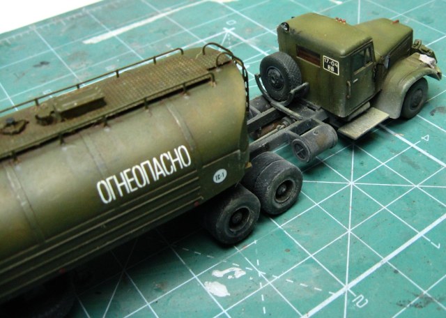 Почти изкоробочная сборка тягача от E-Klass и цистерны от Armory. Добавлены только эльфовские фары и гнутые поручни. Окрас тамиевскими эмалями. Смывка - масло на бензине. Немного подгажено пастелью и тамиевской пудренницей. Футура в качестве разделительного слоя между эмалью и маслом. Лаки Акан.
