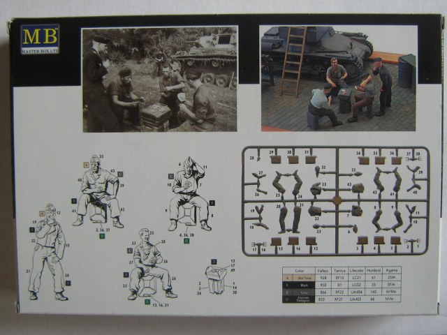 набор состоит из 4 танкистов щенка за пазухой:) деталь номер 28 не посмотрев на схему долго не мог понять что это за кучка такая а потом присмотрелся и понял что это щенок:)