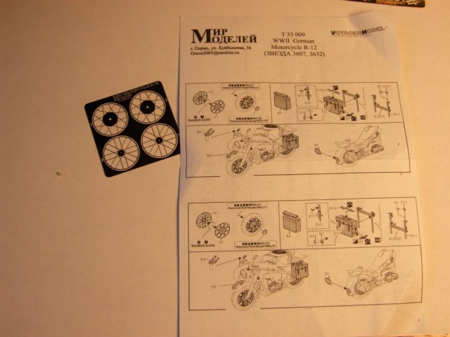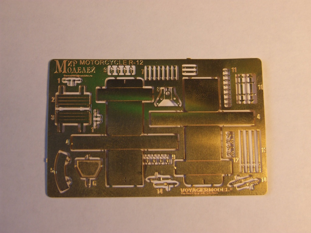 Набор фототравления для звездовского BMW R-12 от Мира моделей. Набор несколько упрощенный по сравнению с Voyager - только две сумки, нет каких-то еще мелких деталей. Но мне это не страшно, набор покупался для мотоцикла без коляски. Ещё не понравилось качество инструкции - маленький некачественный ксерокс. Стоимость набора 140 руб.