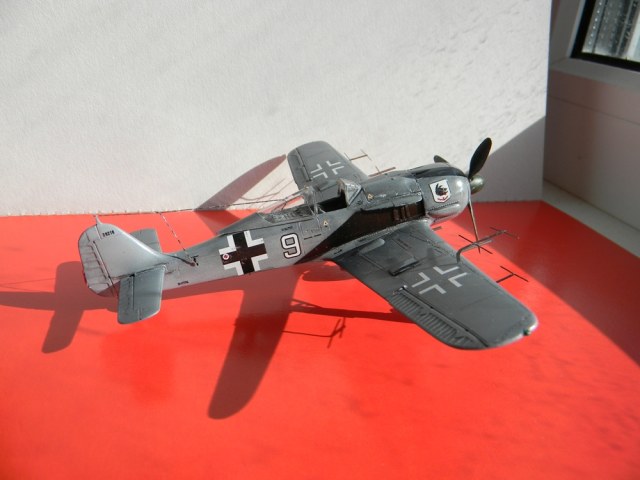 Кит от Ревелл порадовал хорошей сходимостью и проработкой деталей , но очень огорчил фонарём кабины - пришлось заменить на фонарь от Звездинского Фоккера и провести небольшую косметическую операцию на фюзеляже . Использовалась травлёнка от Эдуарда. На этой модели впервые отрабатывал эффект выгорания , получилось не очень удачно - нетерпение в этом деле противопоказано и вобще процесс осветления не терпит суеты ...