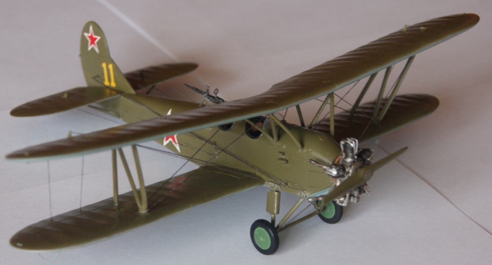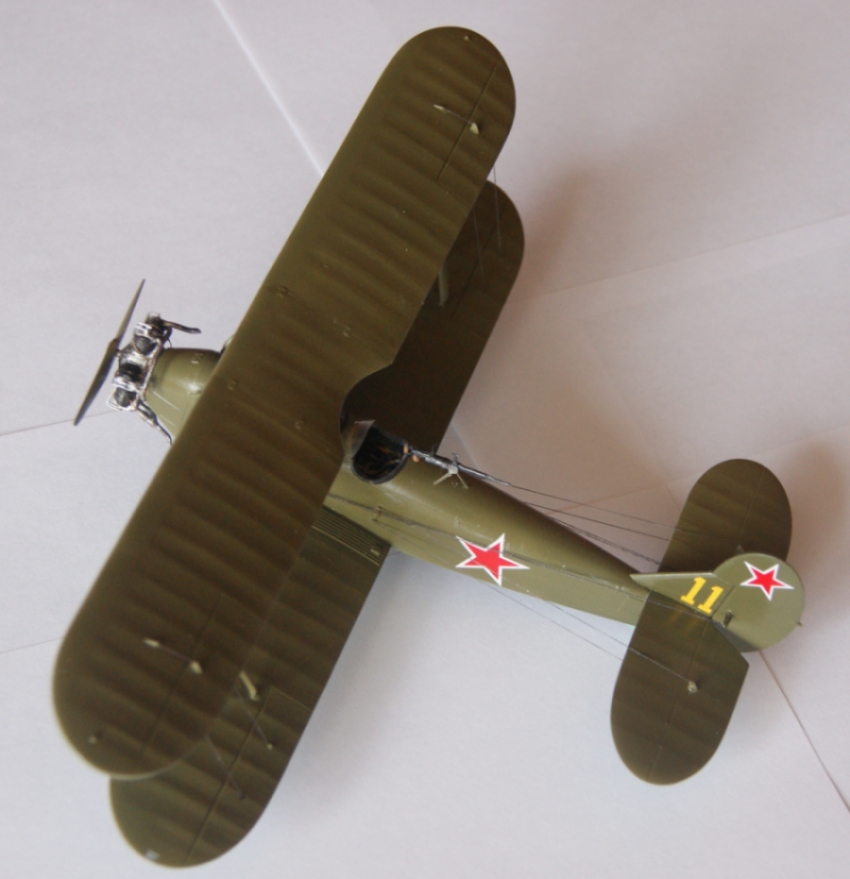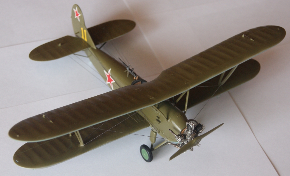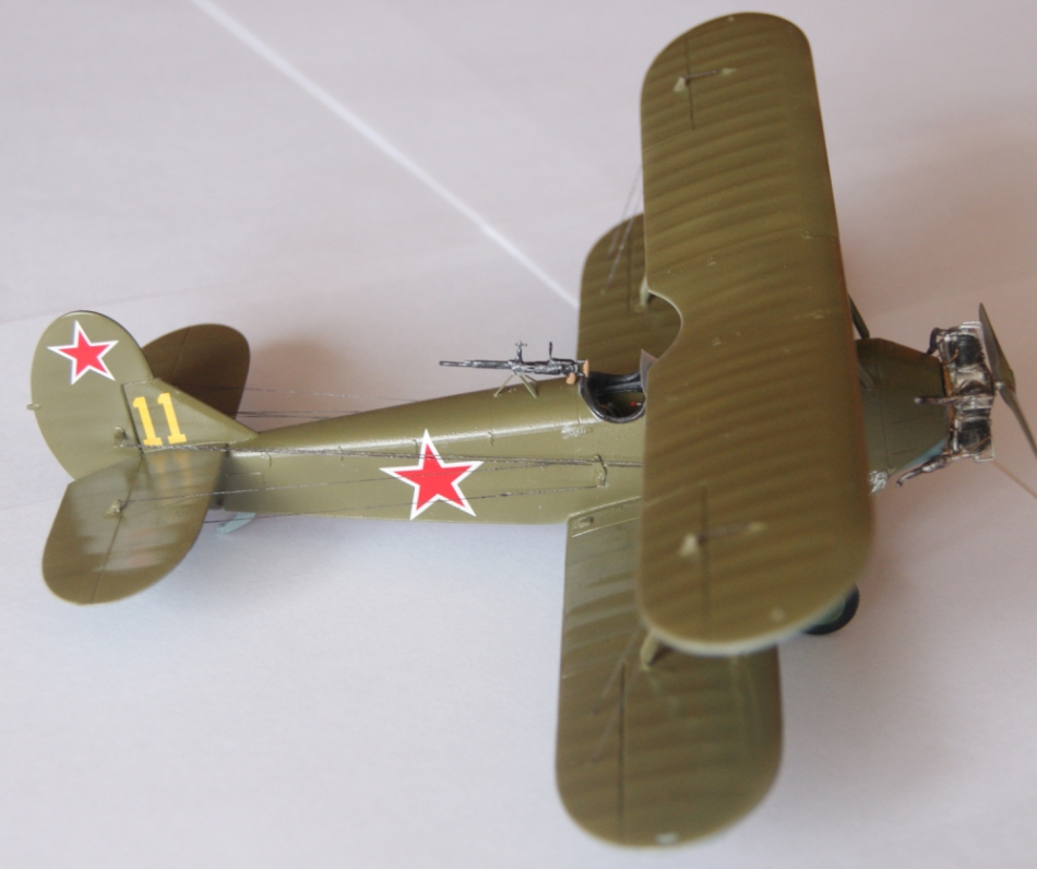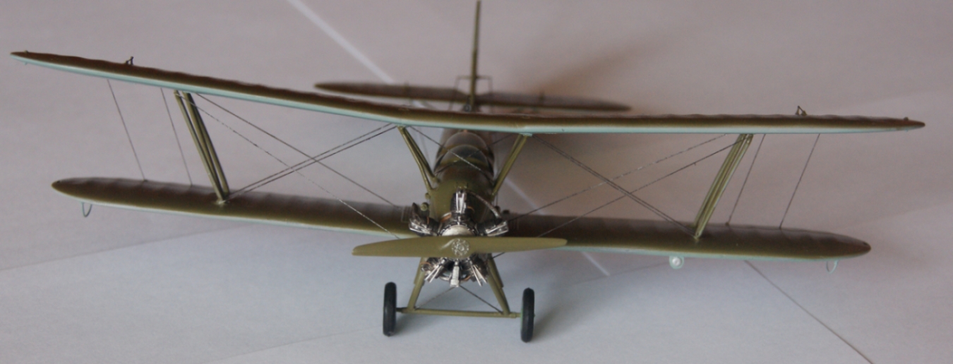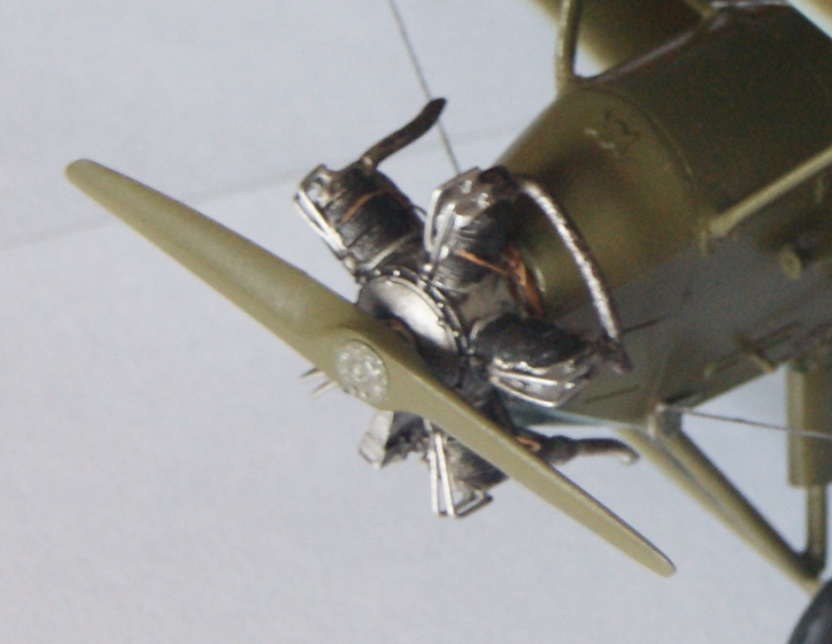 - Покрасил все части, нанес декали, натянул троса ( эластичная нить от HOBBI + PLUS ) , все за исключением элеронных. Приклеил верхнее крыло и натянул элеронные троса, покрасил их под рржавчину и методом сухой кисти прошелся серебряночкой. Приклеил двигатель и шасси ( Авиа экипаж )