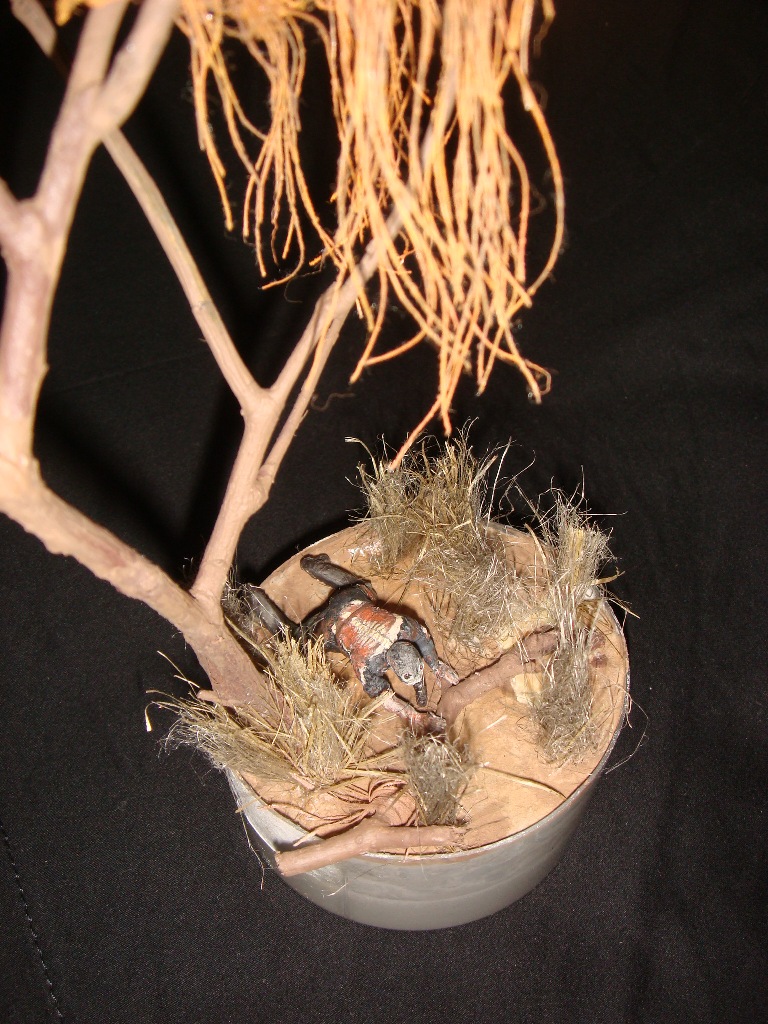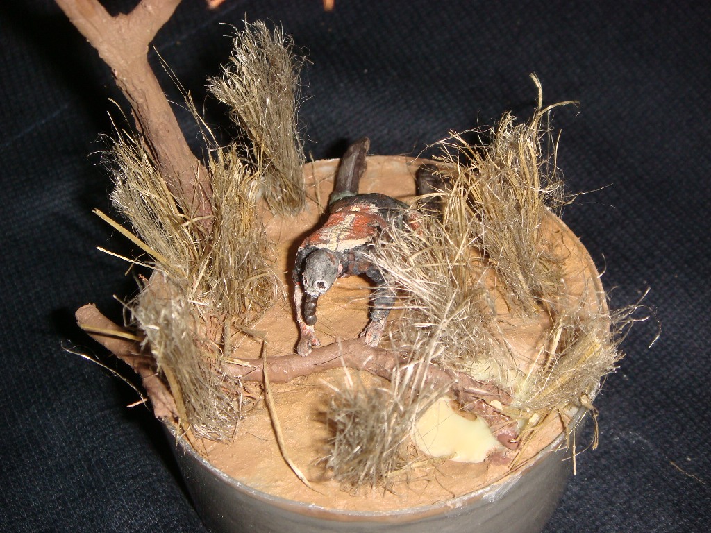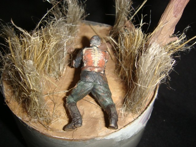На ней я попытался изобразить маленький фрагмент Чернобыльской зоны отчуждения из компьютерной игры S.T.A.L.K.E.R., а именно мутанта, именуемого снорком, и аномалию "ржавые волосы" (на дереве). Снорк собран из фигурок набора Звезды "Зенитный пулемёт ДШК с расчётом". Маска противогаза сделана из пластилина, окуляры из проволоки, гофра (шланг) из пластиковой детальки (не помню от куда и от чего...). "Ржавые волосы" - вата и нитки. Трава - сантехнический лён. Основание - алебастр. Всё окрашенно кистью, акриловой краской неизвестного производителя…