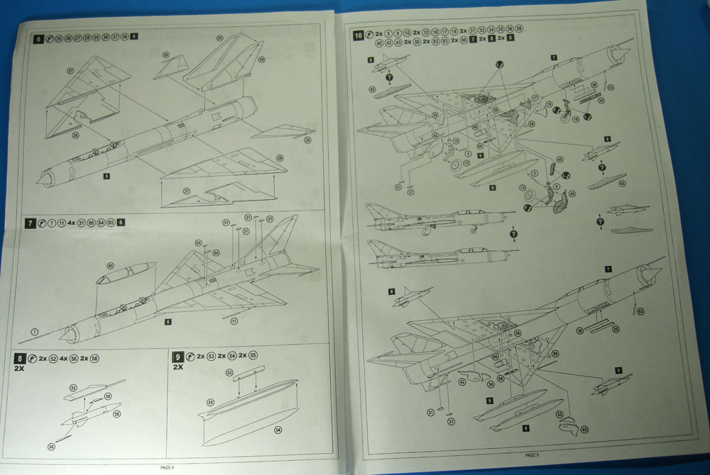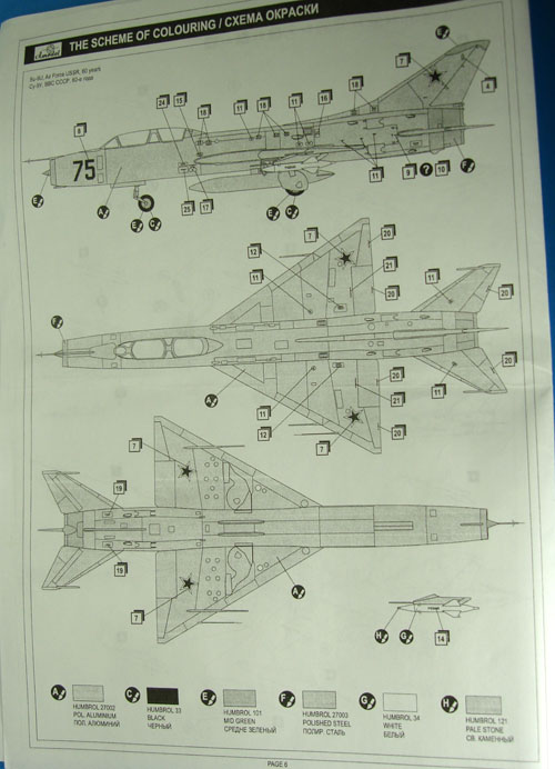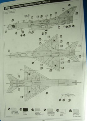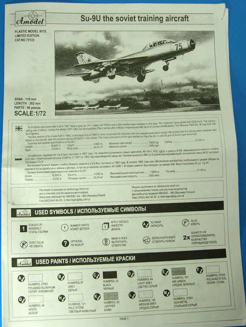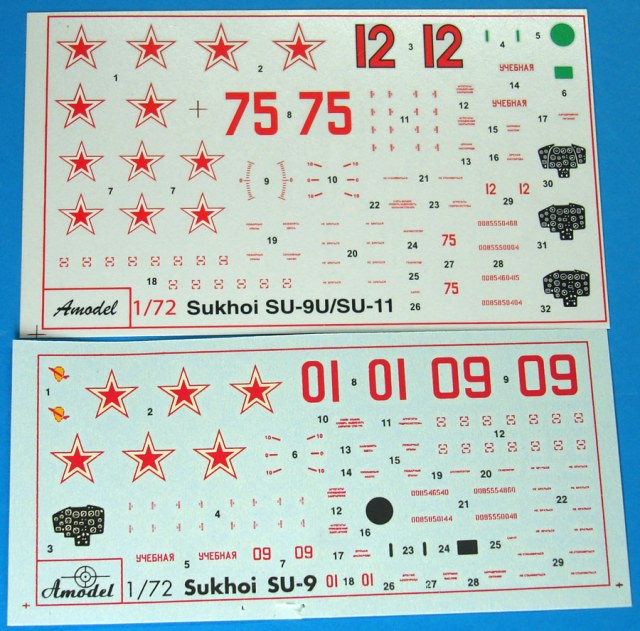 Коробочки стандартные- нижняя, литники и остекление в отдельных пакетах с клипсой, инструкция стандартная для а-мода, вполне понятная и лаконичная. Декаль ( для Су-9У унифицирована с Су-11) содержит необходимый минимум читаемой технички на один вариант для "утки"