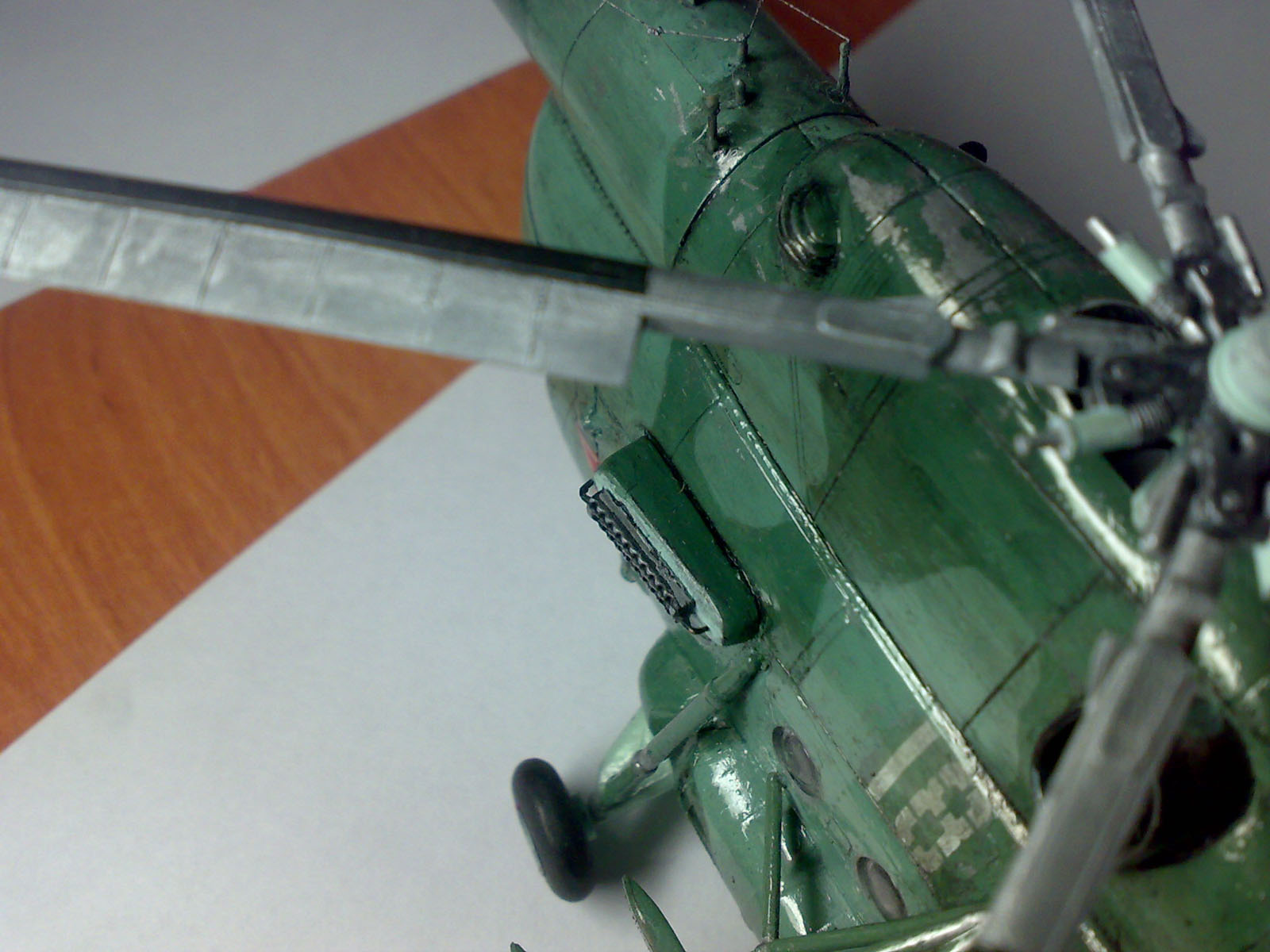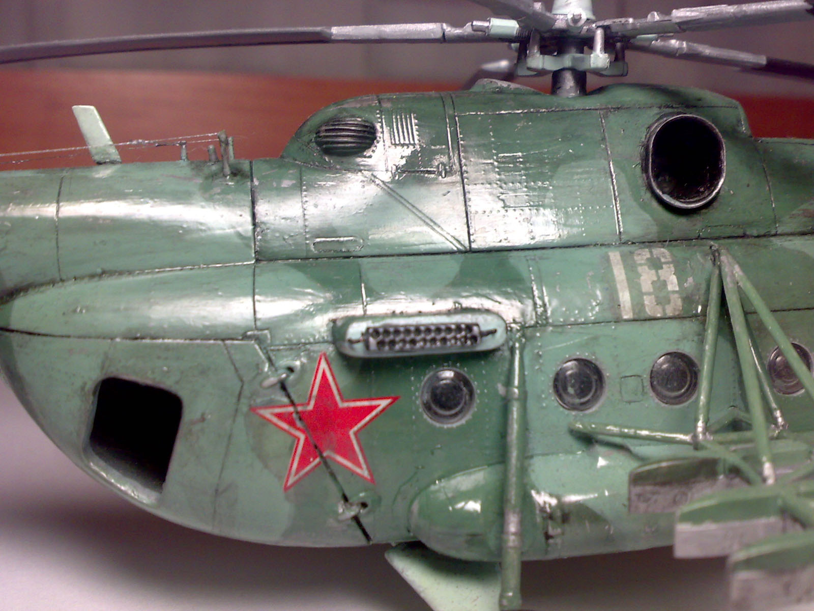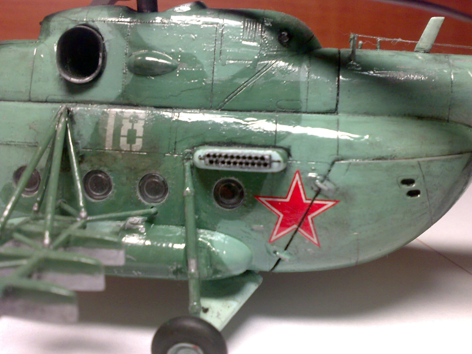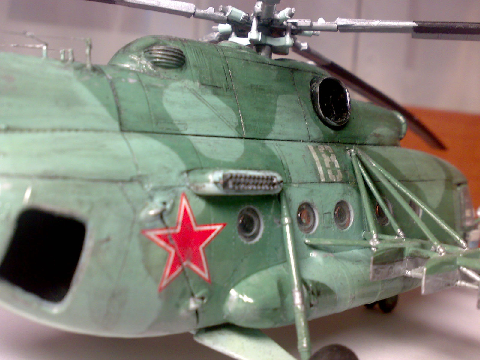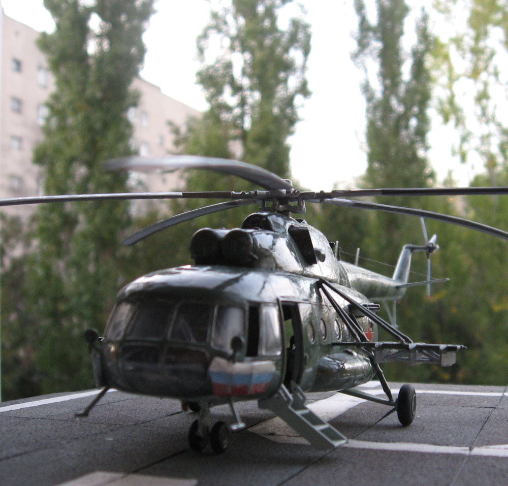 Здравствуйте уважаемые моделисты! Хочу представить вам свою вторую по счету модель вертолета. модель строилась очень тяжело по сравнению с предыдущей, при склейке были видны щели приходилось применять шпаклевку. Здесь первый раз попробовал смывку правда не уверен что получилось хорошо.Возможно большой слой лака нанес. Поэтому жду ваших замечаний и советов. Смывку сумел нанести со второй попытки, впервый раз сделал смывку на основе уайт спирита и краска местами слезла- пришлось перекрашивать заново. второй раз делал нна воде с фейри. Из доработок сделал зеркала, ручки на створках,и антенны кв., перенес блоки АСО с хвостовой балки на борта. Модель окрашивалась красками от звезды. Красил кистью. Жду ваших замечаний и советов.
