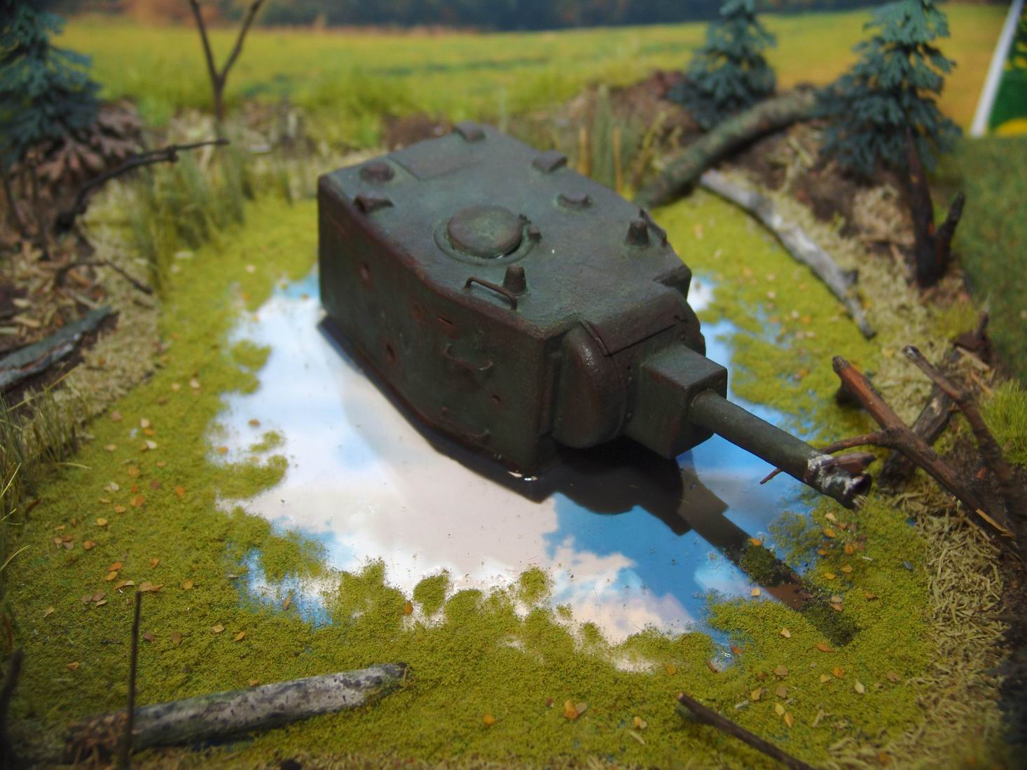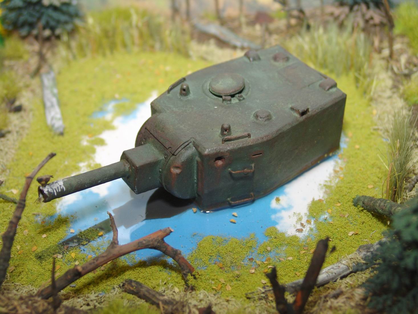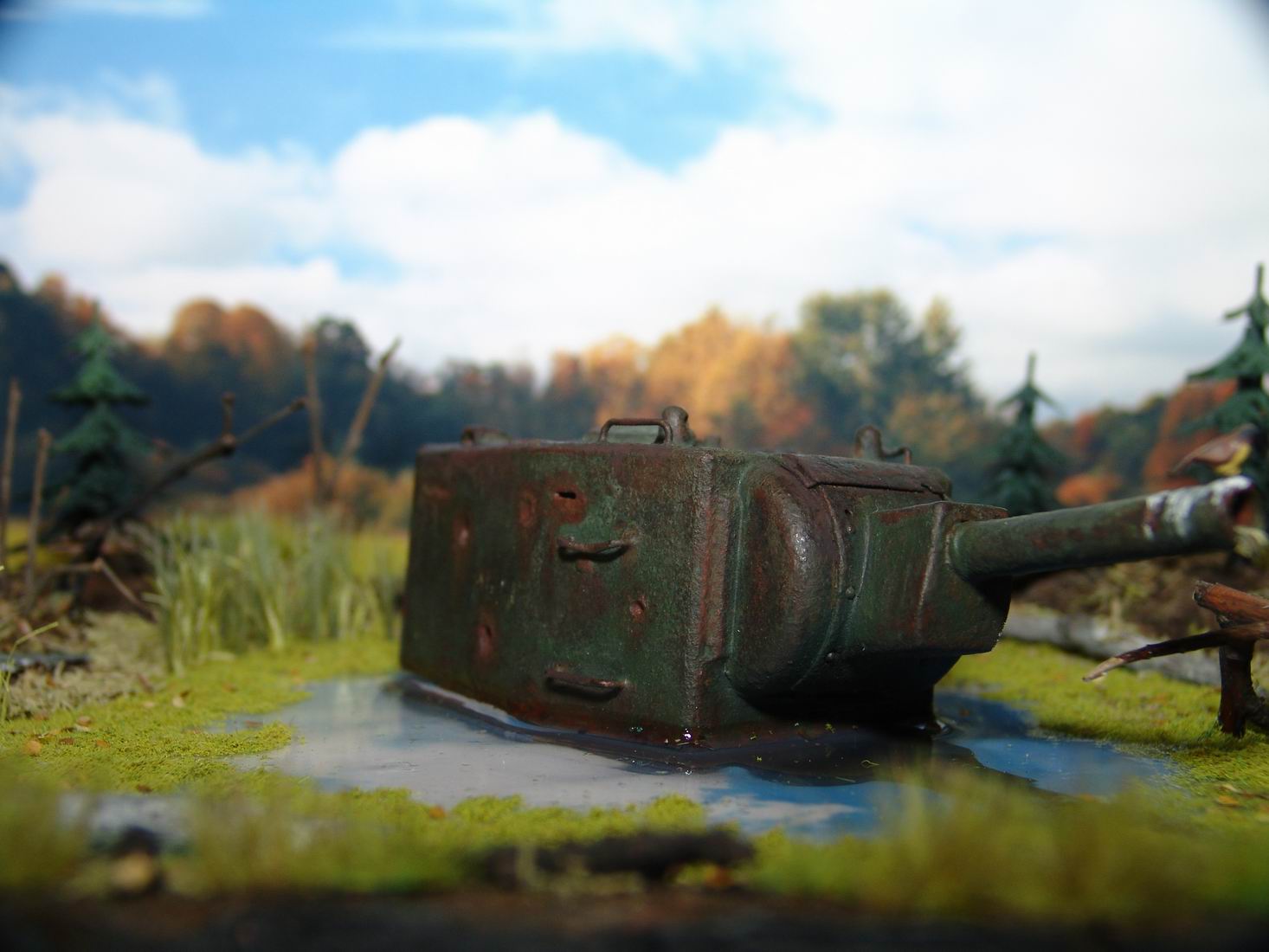 Выношу на обсуждение диорамку Эхо войны. Когда то почти 70 лет назад танк КВ-2 вышел из боя и завяз в болотине. За прошедшее время танк погружался все глубже и глубже, а болотина, как ей и положенно, зарастала.. Вот. что бы мы увидели, решив пройтись за грибами в теплый осенний день по глухим местам нашей средней полосы ))