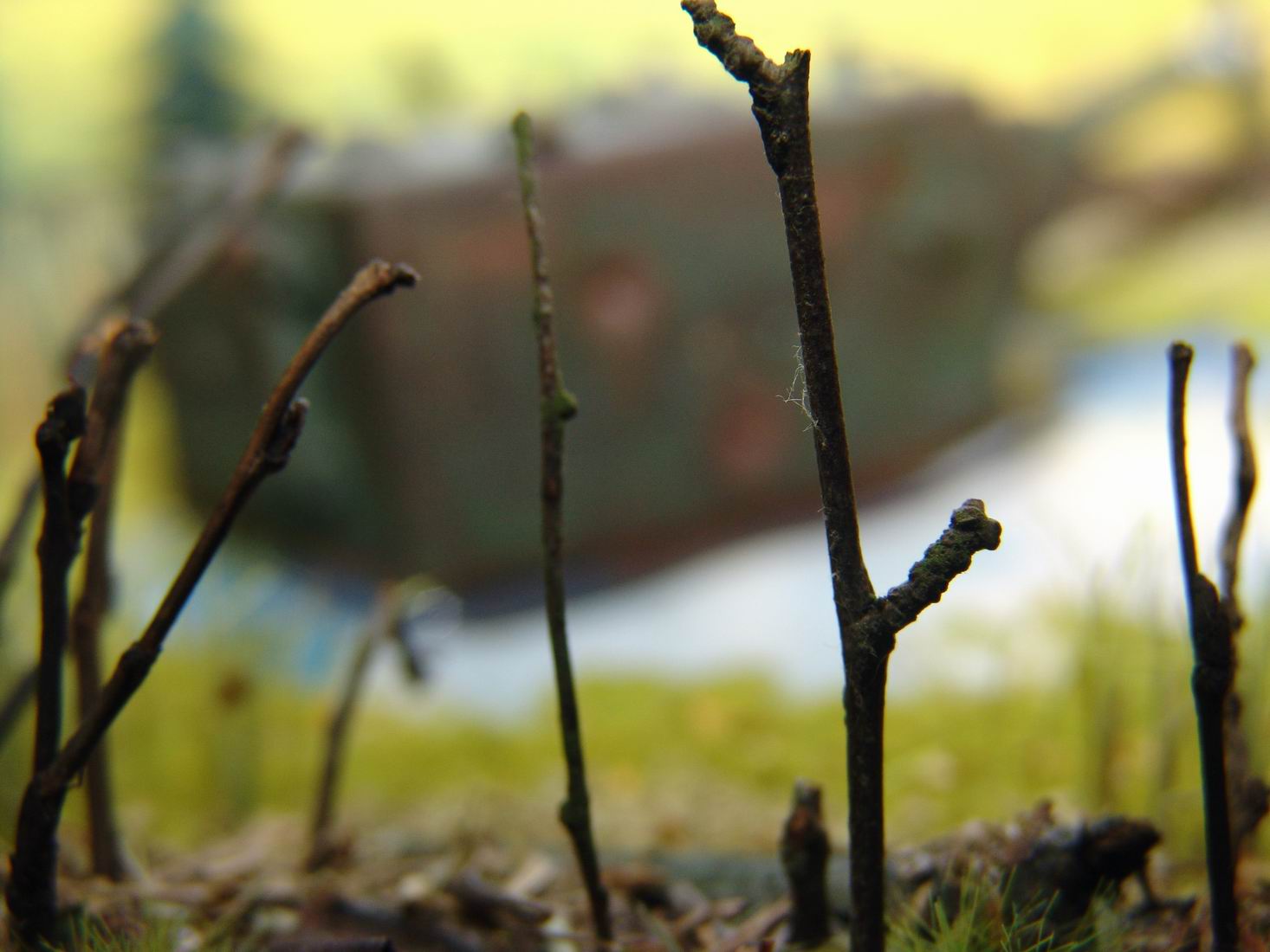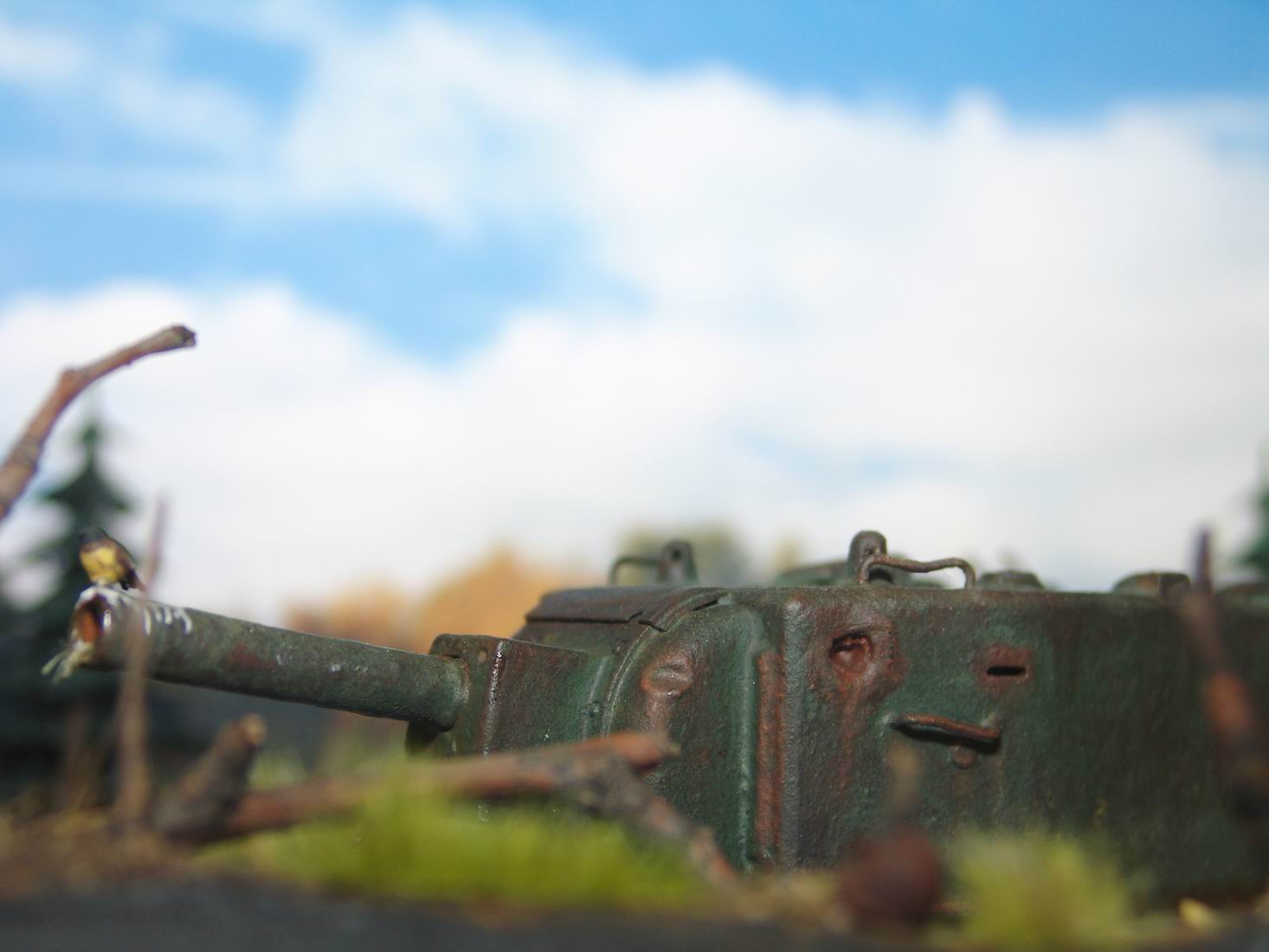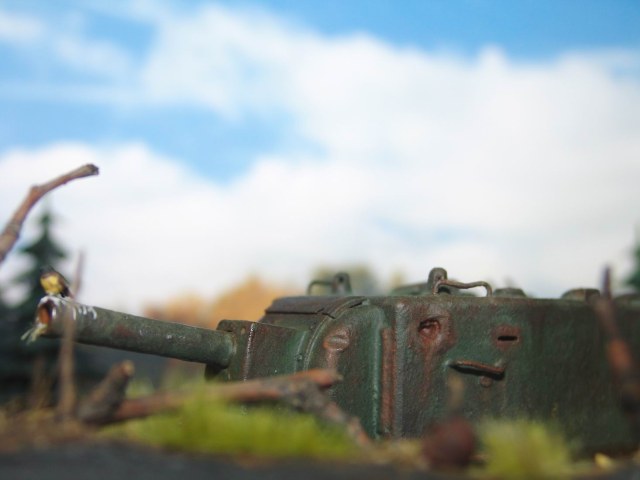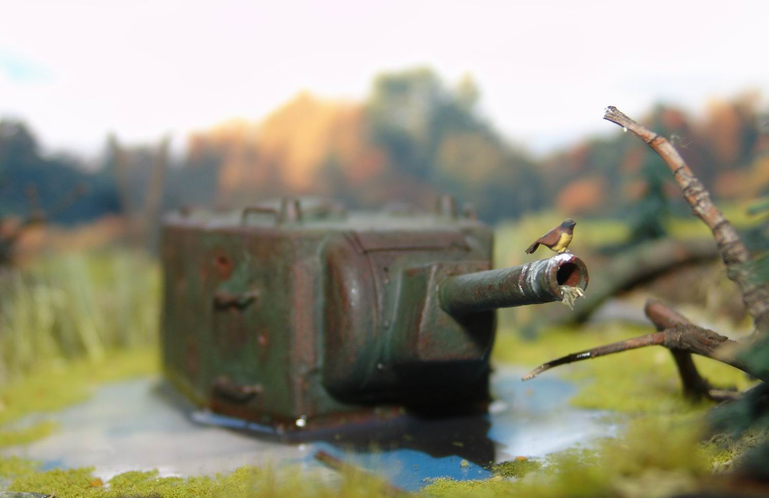 Выношу на обсуждение диорамку Эхо войны. Когда то почти 70 лет назад танк КВ-2 вышел из боя и завяз в болотине. За прошедшее время танк погружался все глубже и глубже, а болотина, как ей и положенно, зарастала.. Вот. что бы мы увидели, решив пройтись за грибами в теплый осенний день по глухим местам нашей средней полосы ))