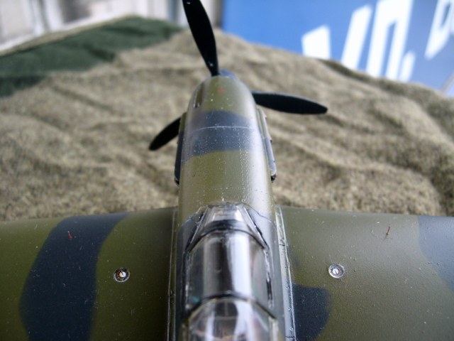 Сборка, прямо скажем, не из лёгких. Большие проблемы возникают на стыке зализа крыла и фюзеляжа, а также на капоте перед кабиной пилота. А капот с пулемётным портом доделывался при помощи двухкомпонентной шпаклёвки. Все нестыковки устранялись большим количеством Tamiya Putty. После долгих "шкурных" работ все металлические части самолёта были оклеены фольгой-самоклейкой, нарезана расшивка и накатаны клёпочные ряды. Впервые использовал грунтовку Tamiya Surface Primer- хАрошая вещь!