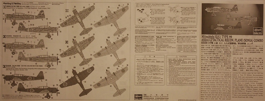 Двойной набор (СОМВО) от Hasegawa лёгкого бомбардировщика Ki-51 Sonia. Зачем так сделали - непонятно: в коробке два абсолюно одинаковых набора. В пердыдущем обзоре Зеро они хоть деталями отличались. Здесь же всё отличие заключается в том, что в первом варианте окраски под крыло подвешиваются бомбочки.