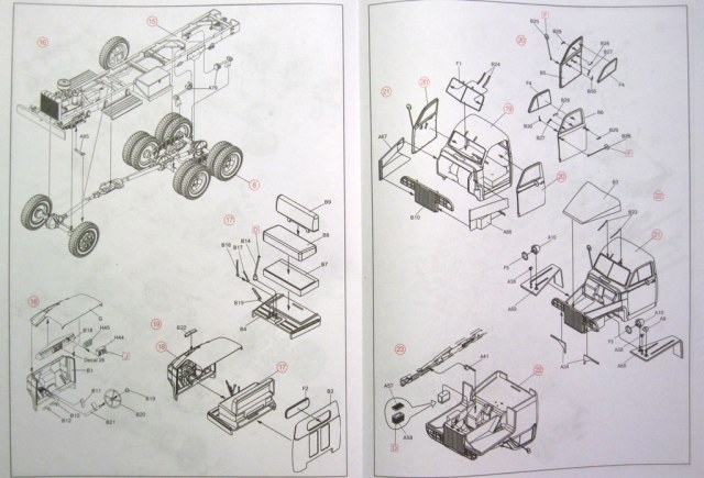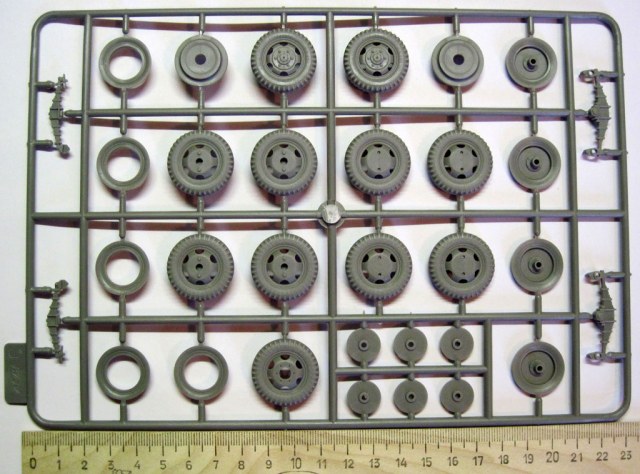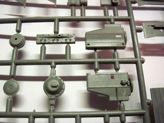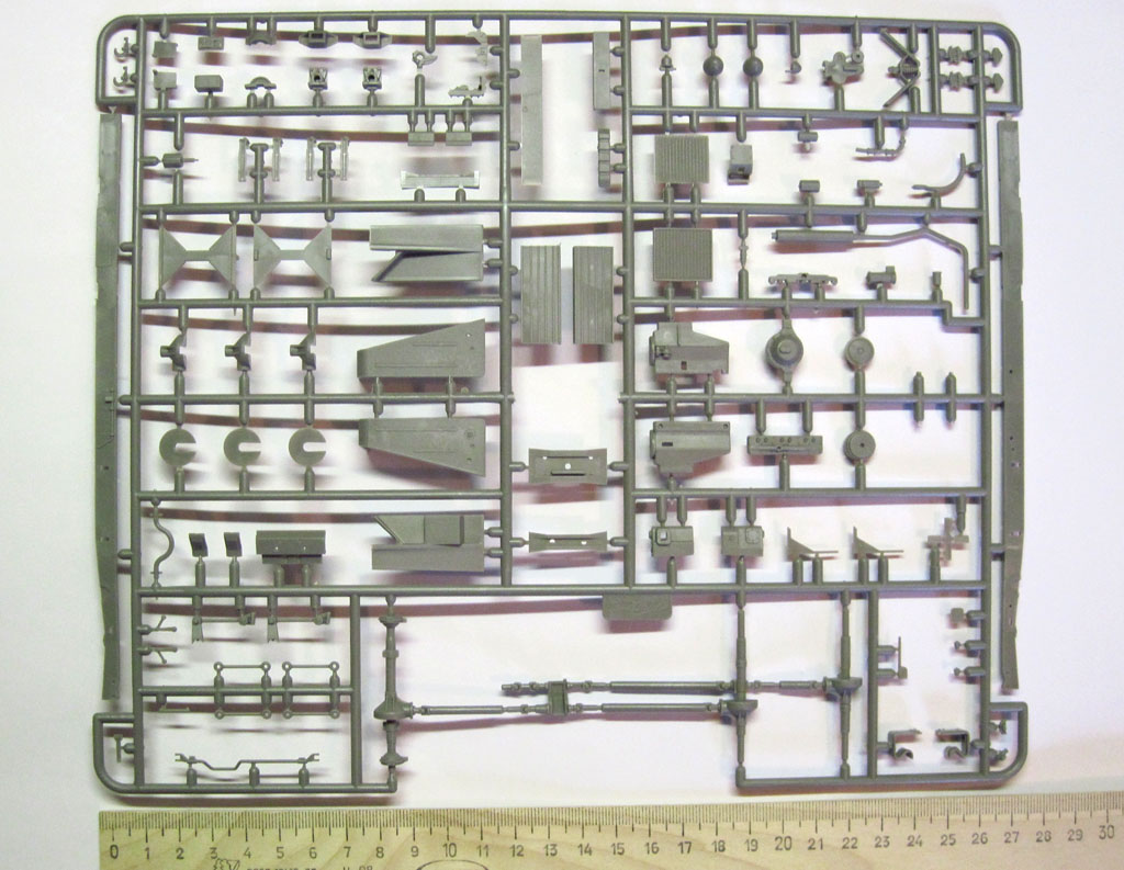 Теперь непосредственно о модели. К картонной коробке среднего размера (31×23,5×6 см.) находится один общий пакет с пятью литниками серого пластика (плюс отдельно идет деталь для крыши кабины) и литником с прозрачными деталями (остекление кабины и фар), 12-и страничная инструкция и декаль. В целом набор производит неплохое впечатление - литье довольно четкое, но и без ложки дегтя не обошлось: