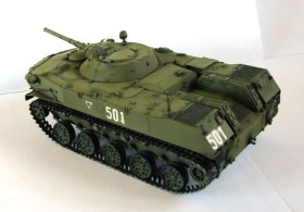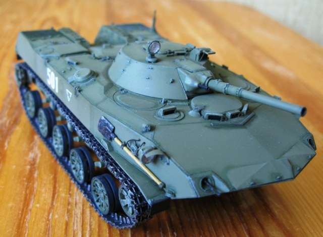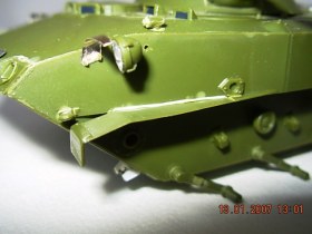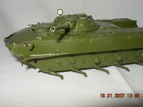 Вопрос к автору:куда девался со ствола кронштейн направляющей ПТУРС "Малютка" ? Это же БМД-1 а не БМД-1П.Гусеничную ленту можно было натянуть как на настоящей машине направляющим колесом за счет кривошипа.В остальном на твердую 4.