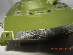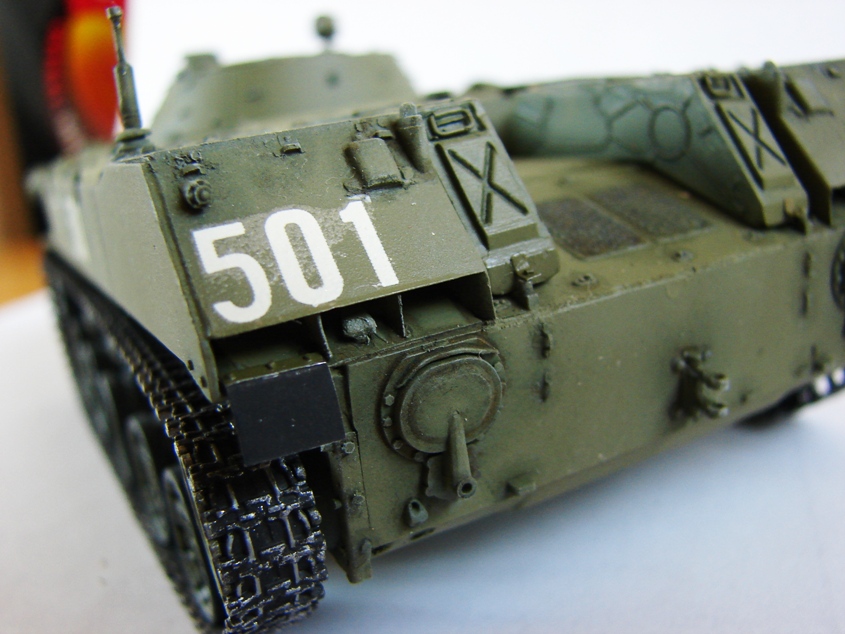С родной гусянкой тоже надо было разобраться "по-взрослому": лучше немного усилить натяг гусениц - будет смотреться естественней, чем прыгающие с поддерживающих катков. Ну и кое-где проскакивает недоприваренная декаль. На 11-й фотке, под б/н - глушитель. Его лучше закрасить чёрной матовой краской и оттонировать пигментом "сажа-копоть". Ну, про то, что неаккуратно обошлись с фарами уже отмечено. Однако в целом работа оставляет очень позитивное впечатление. Хорошо потрудились, коллега!!!