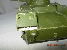 Собирал модель четыре года назад. Доделывал как мог. Гусеничные ленты оставил родные. Впервые попробовал убирать излишки краски ватными палочками. Проклял все. Больше никогда ватными палочками пользоваться не буду. Мелкие волосы остаются на модели. Убрать потом очень сложно. Это видно по модели. Но самый большой косяк, не переделал бронировку смотровых приборов. Модель в целом понравилась. На сегодня взял бы ещё одну и сделал по другому, но занят другими проектами. Надеюсь когда-нибудь к ней вернусь.