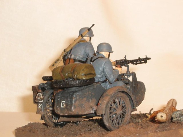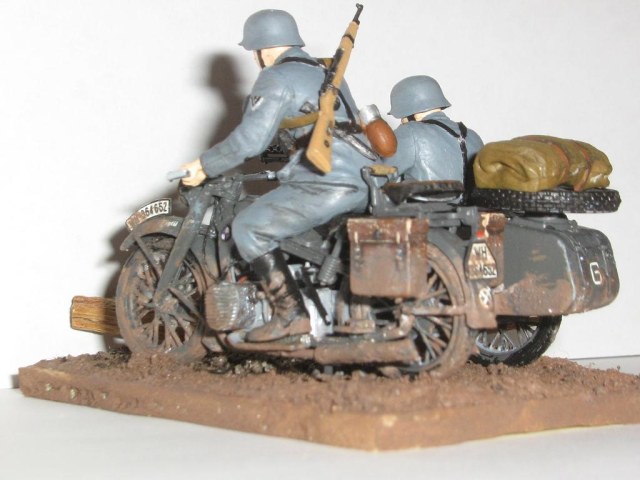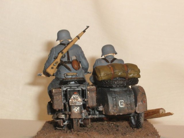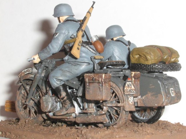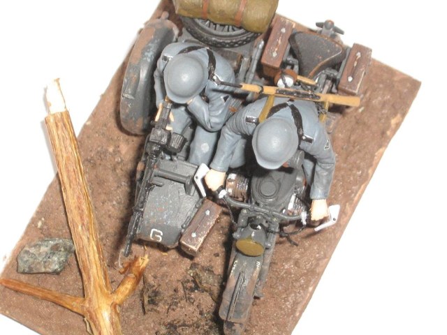 фигурки вышли не очень аккуратно еще по тому, что изначально я их раскрасил так как написано в инструкции, а после того как собрал нашел в интернете реальное фото мотоцикла и формы солдат. пришлось перекрашивать, а уже не во все места подлезешь... ну, урок на будущее...