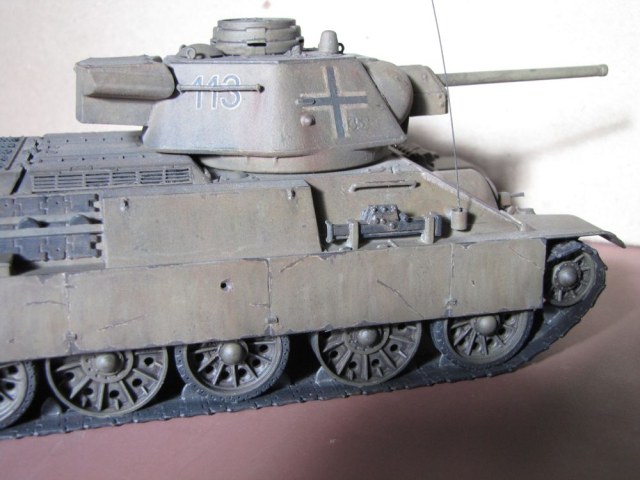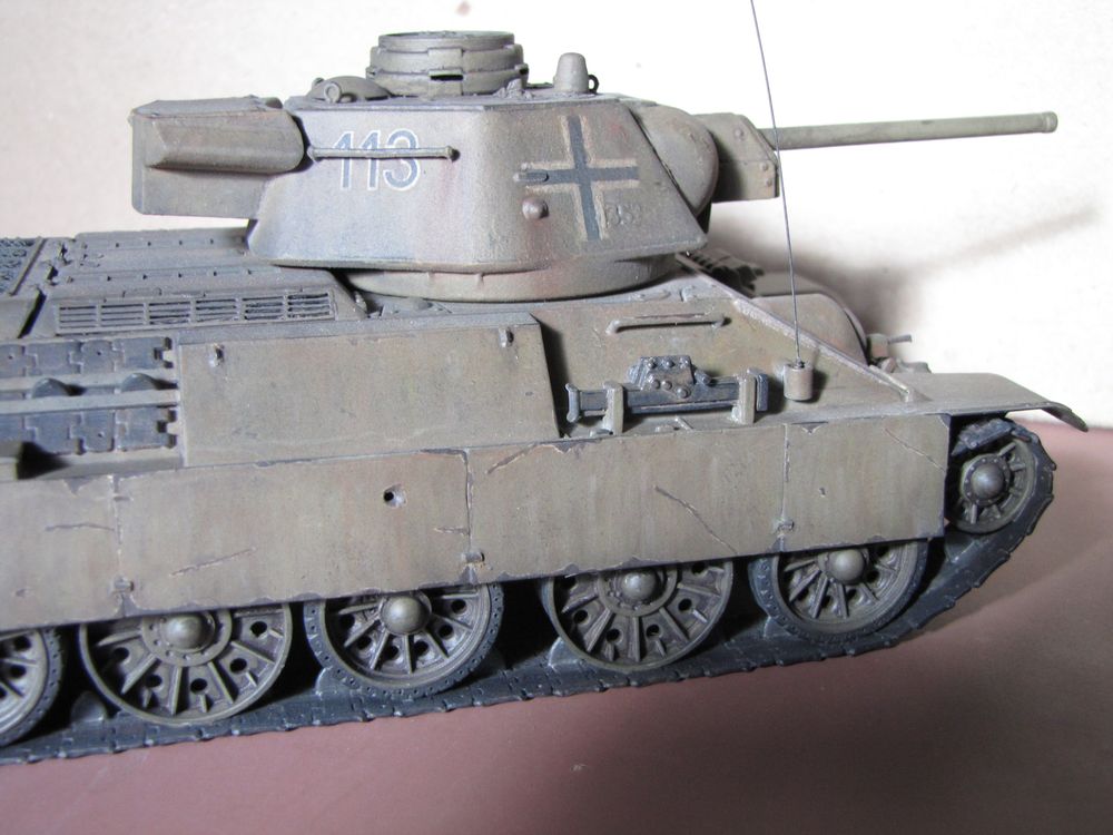 Отличная машина получилась, окраска хорошая. По матчасти Т-34 не спец, но думается, что в трофейных машинах могли присутствовать очень причудливые сочетания элементов, ведь вряд ли машины захватывались в идеальном состоянии, а для их восстановления могли использоваться детали и агрегаты различных машин. Тем более, что на фото явно запечатлена лишь малая часть имевшихся танков (это касается любых образцов того времени).