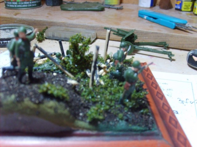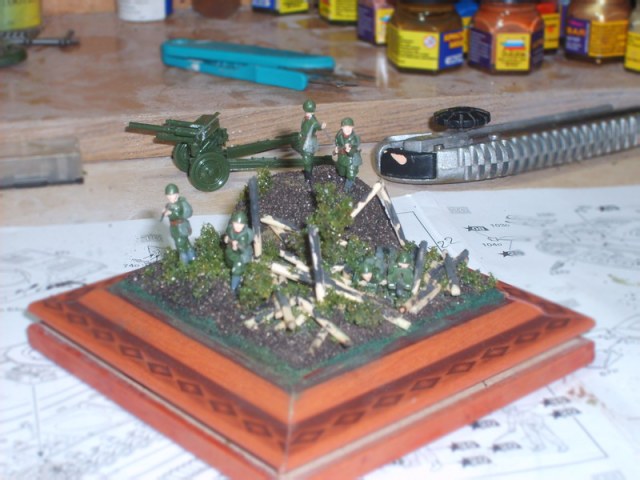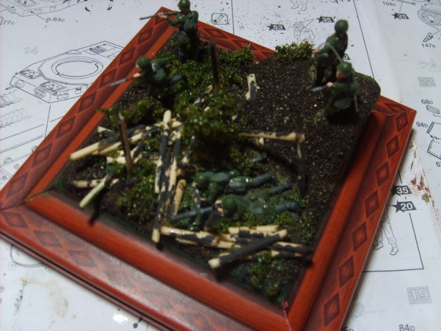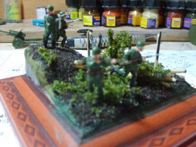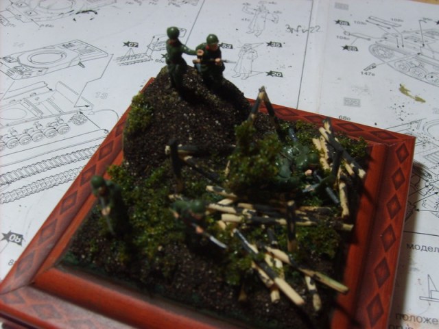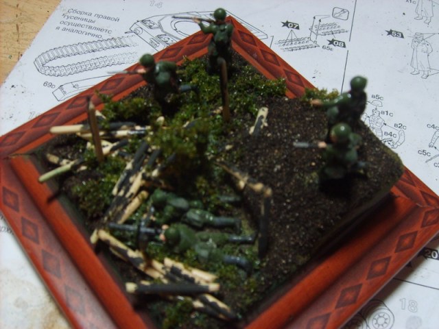 Доброго вам дня товарищи моделисты. Хочу представить вам мою старую работу(как то раз я ее выкладывал) но мне пришлось ее переделать так как она выглядела по детски , а именно земля. Фигурки в масштабе 1/72 , от Звезды . Поваленные бревна где расположена пулеметная точка, это эмитация сгоревшего дома.Ну наверное это все что я хотел рассказать, спасибо за внимание.