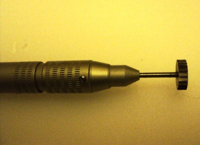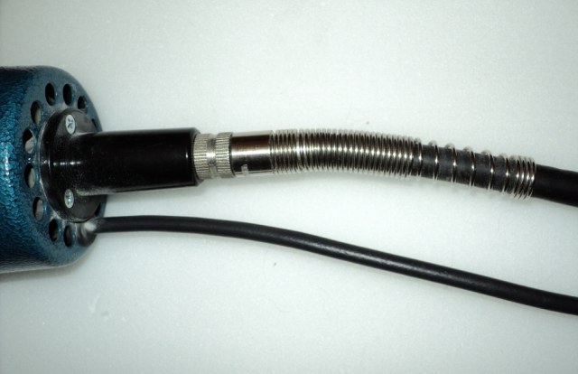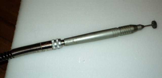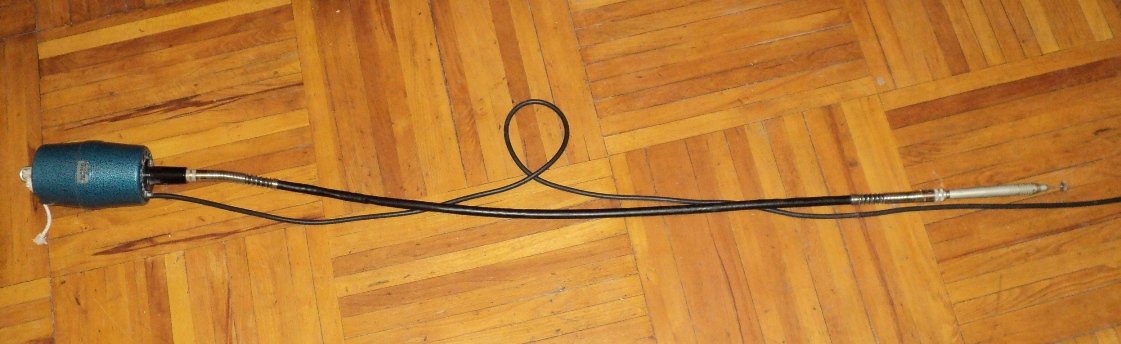 Ну так вот: ещё зимой моё внимание привлёк сей аццкий агрегат – бормашинка ЮМО. И вот полгода спустя я его заснял! Паспортная скорость вращения «шпинделя» у неё аж 12000 об/мин, а это целых 200 об/с. Для пластика она вряд-ли подойдёт помимо громоздкости она из-за своей дикой мощности просто плавит пластик, а не режет его. К тому же чёрный шланик (или рукав по научному) можно неосторожно согнуть, и он просто сломается. Пользуются ей так: моторчик подвешивается над столом так, чтобы рукав не сильно сгибался, а потом режут, не забыв про респиратор и вентиляцию.