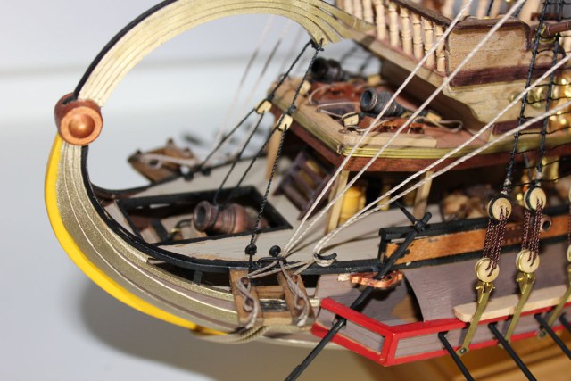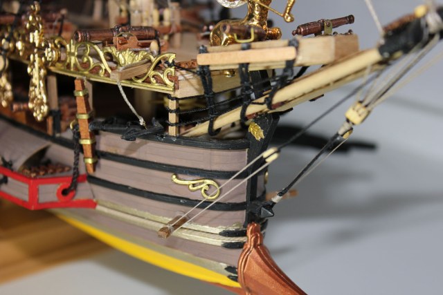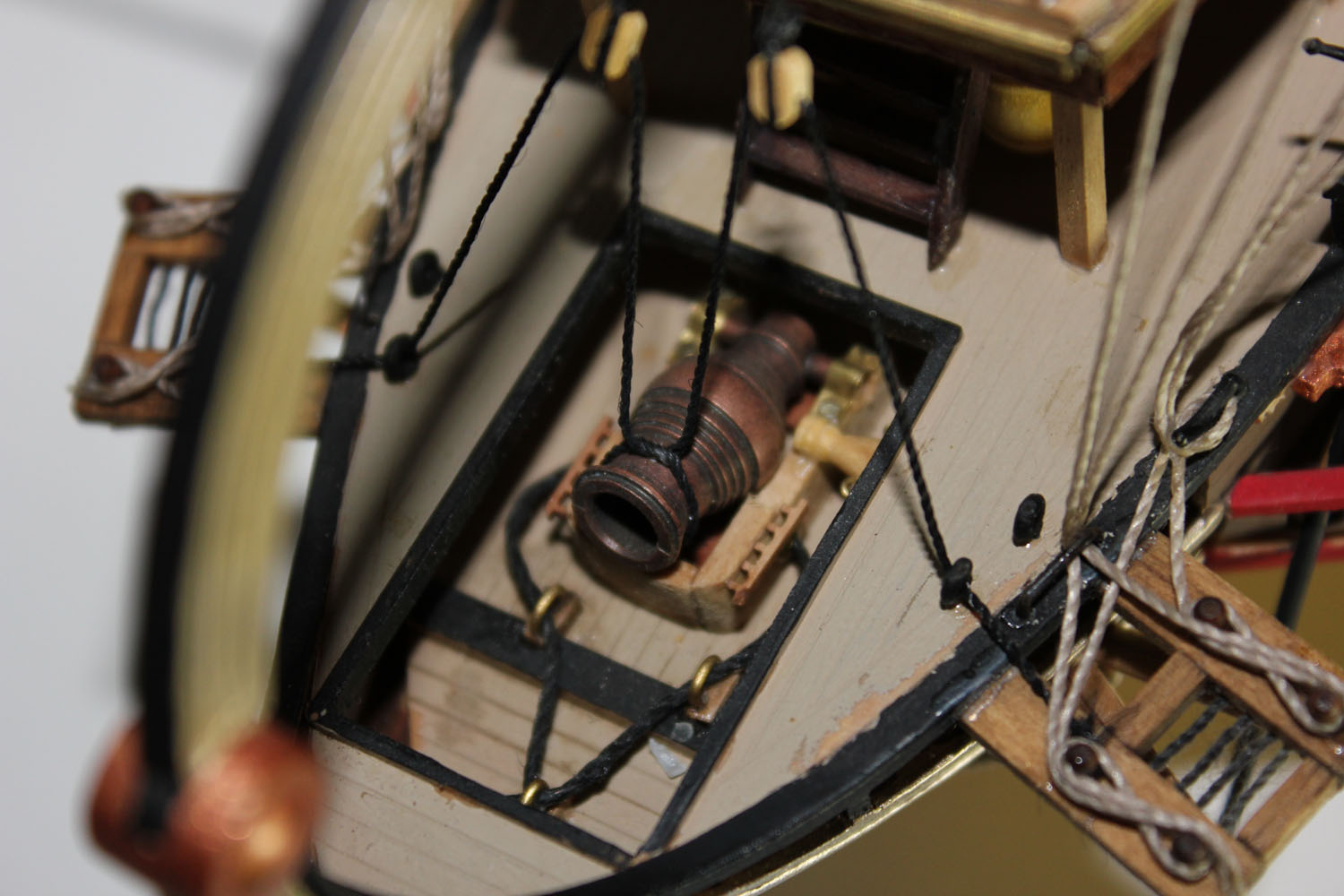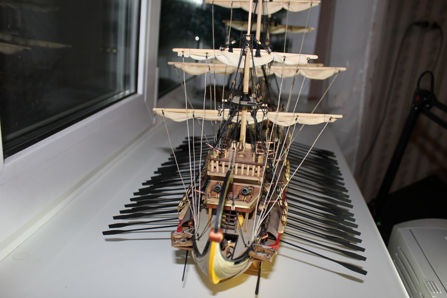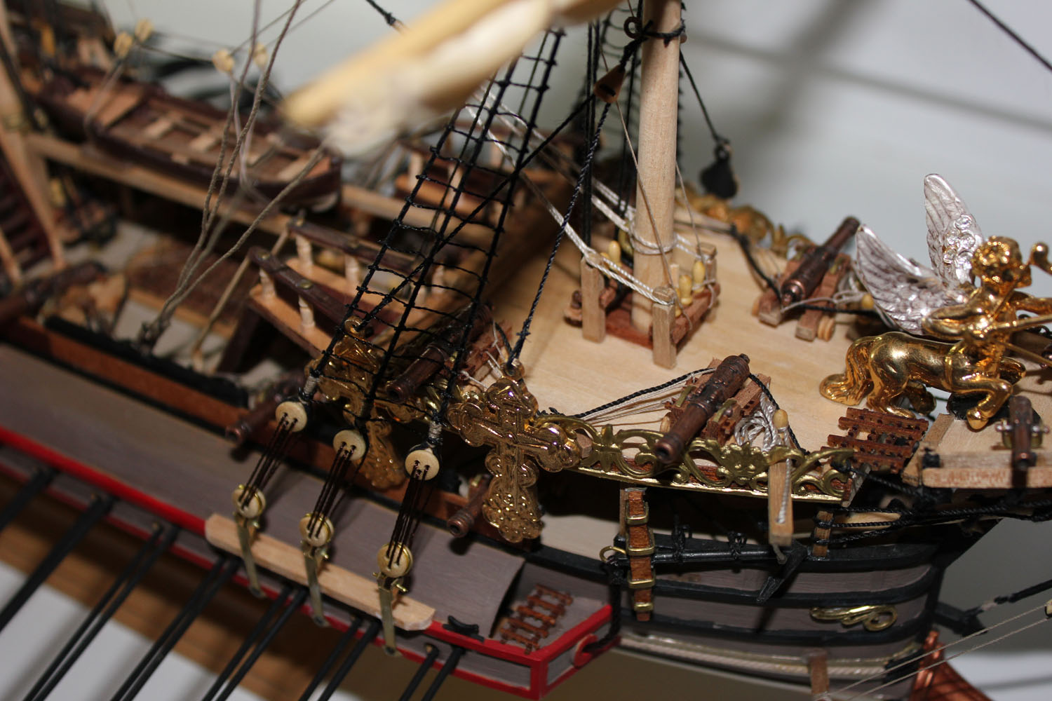 Модель потрясающая!!! )) Красоты необыкновенной!!! Единственное что смущает - это кормовая мортира (фото 5 и 14). Как она может стрелять через корпус (не знаю как называется эта дуга на корме, которая регулирует угол подъема орудия)?