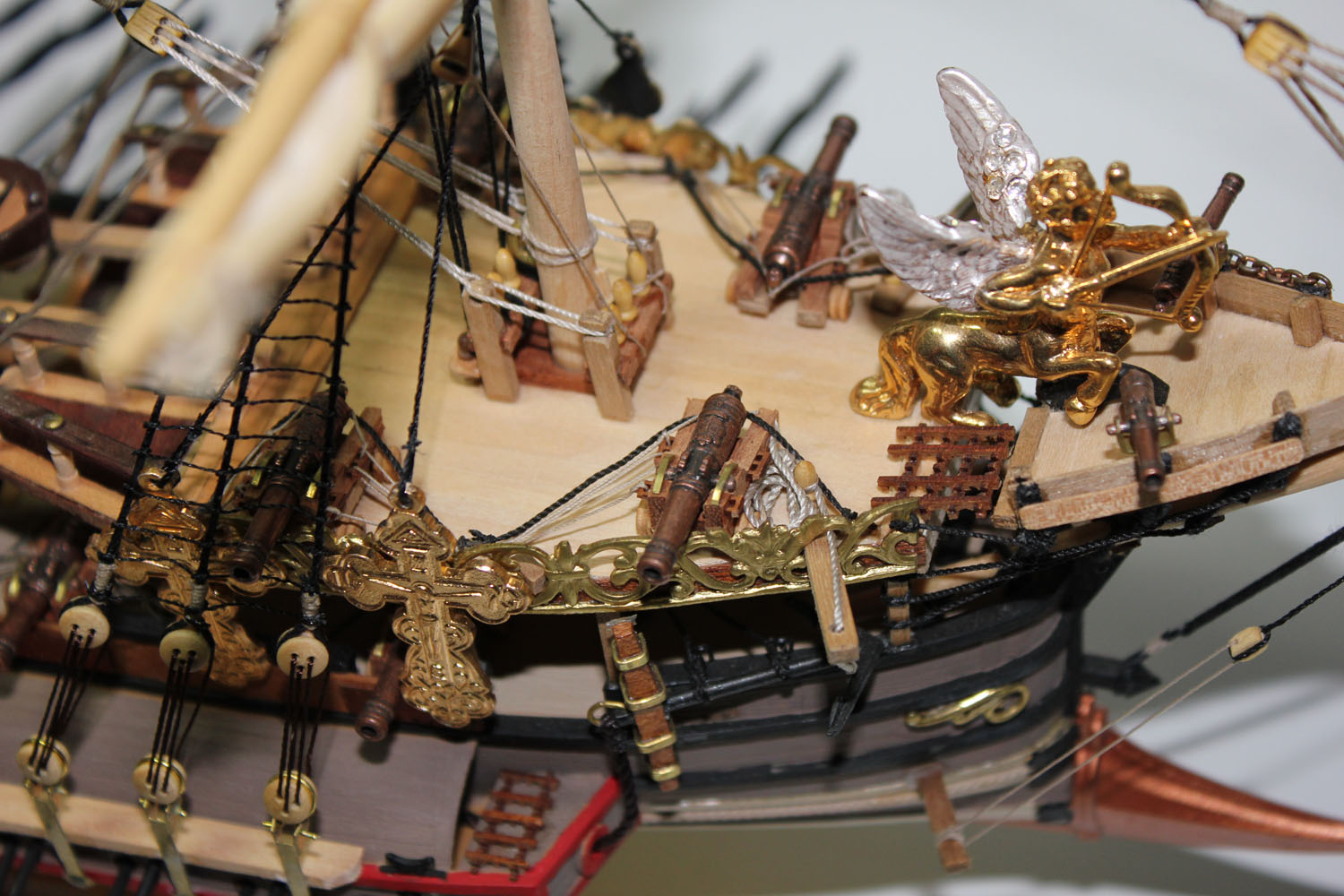 Что касается самой модели, то глаз оторвать от Вашей работы невозможно. Пластик только угадывается. Дерево,"старая бронза", "золочение",такелаж и фантазия создают дивный образ устремлённой силы, всесокрушающей мощщи.