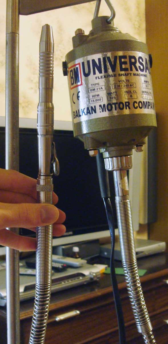а это моя домашняя бормашинка очень люблю её за то что включается с помощью педали и обороты можно регулировать нажатием ноги не знаю почему вы не любите такие машинки некоторые говорят что есть биение от тросика не знаю такого не наблюдал т.к. работаю в основном на малых оборотах да и максимально насиловать её не приходилось очень удобная и кстати достаточно тихо работает мотор