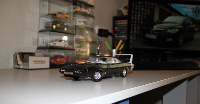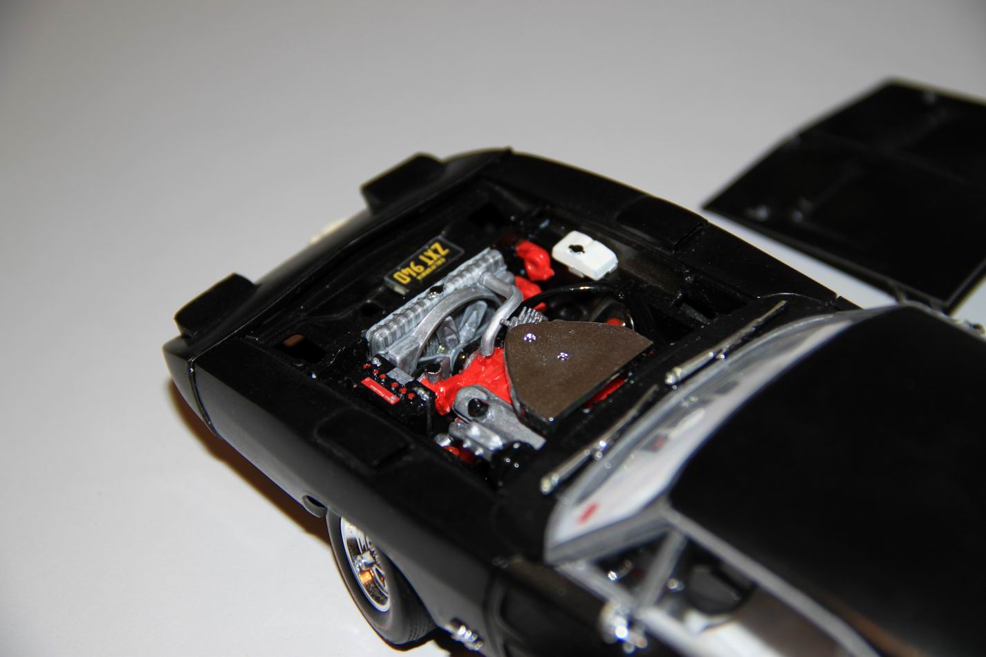 Мне очень нравятся американские машины 60х годов. Этот автомобиль был самым быстрым в те годы. Я долго искал эту модель и нашел в Германии, заказал. Через несколько месяцев ожиданий она пришла. Модель очень качественная. Масштаб модели 1/25. Собрал и покрасил. Сделал крутящиеся вентилятор системы охлаждения двигателя, карданный вал и руль; сделал открывающиеся передние фары (полностью фары деталировал сам по фото настоящей машины,сделал в них даже муляжи ламп... тк фар не было вообще), вставил боковые стекла (их тоже не было), сделал открывющийся багажник и двери. Карбюратор тоже съемный, тк в комплекте было два (спортивный и обычный), можно менять их. Номера на машине тоже съемные, можно менять на все три комплекта, которые с ней шли.