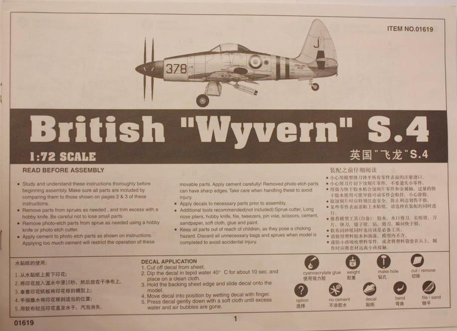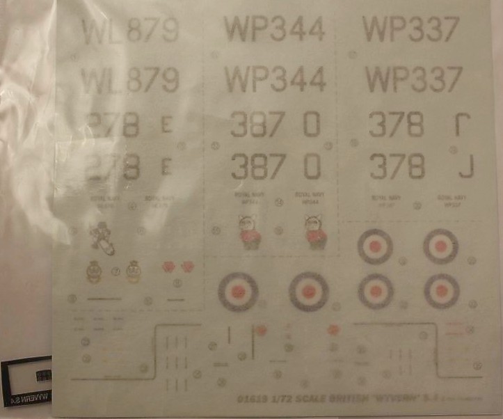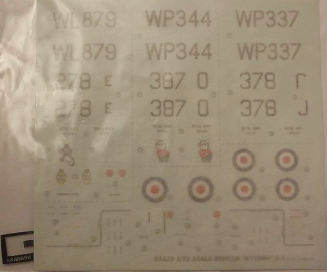 Деталировка богатая, можно собрать со сложенным крылом и разными вариантами подвески. Декаль на три машины, причём первая - участница боевых действий (операция "Мушкетёр", Суэц, 56 год).