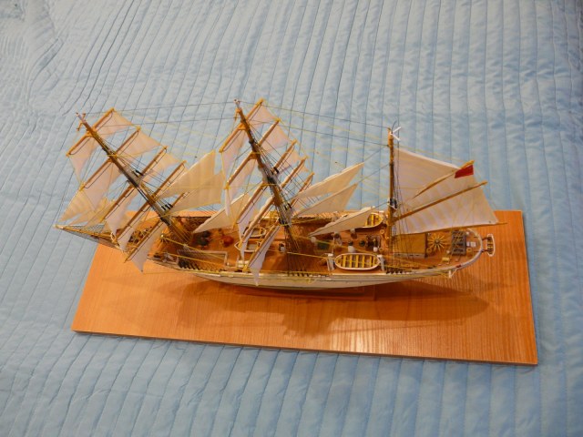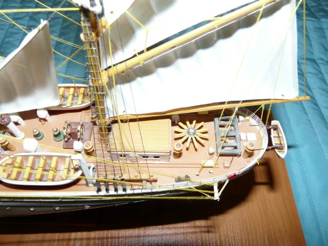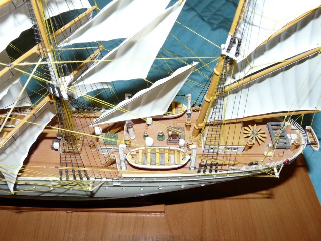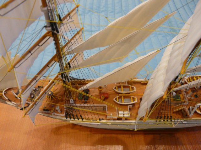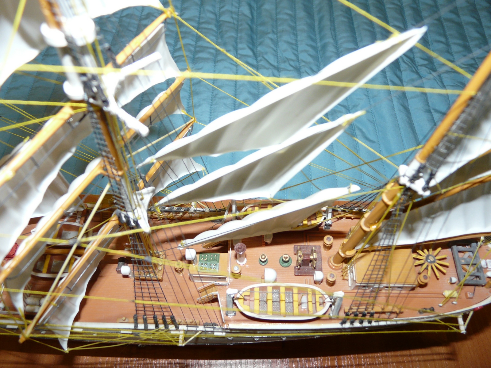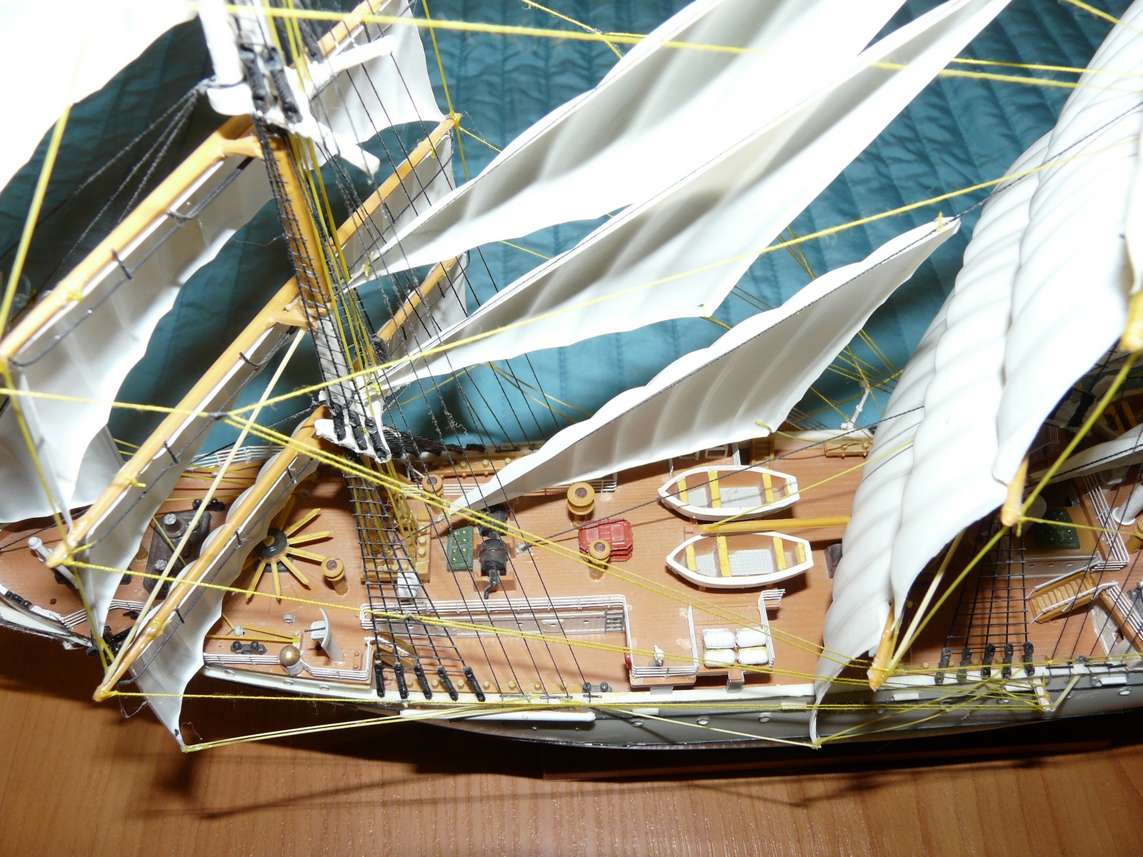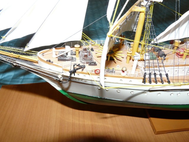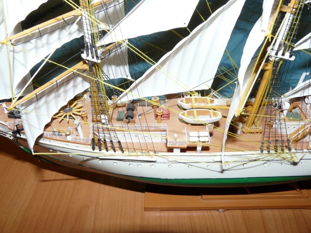 Не очень понравились пластиковые паруса. Даже при моей любви к пластиковым парусам, эти не смотрятся. Грубые очень. И еще они вырезаны не правильно. Хотя если их вырезать как положено, они будут выглядеть, наверное, еще хуже. Цвет бегучего такелажа не очень понравился.