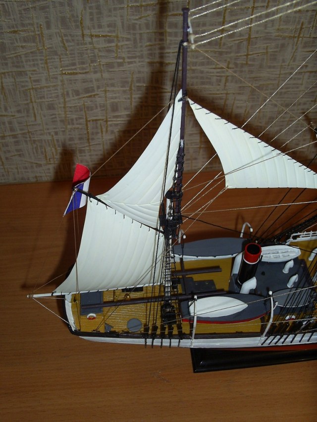 Паруса я покрасил (белая краска + желтая), т.е. на самом деле они белые с бледно-желтым оттенком. Фотография не передает полностью их цвет, я знаю и на подсознательном уровне вижу этот оттенок, а так я бы тоже не приметил его. С такелажем было действительно сложно, один натягиваешь, второй провисает и т.д. Такелаж и ванты - это самое сложное для меня, хуже всего и получилось.