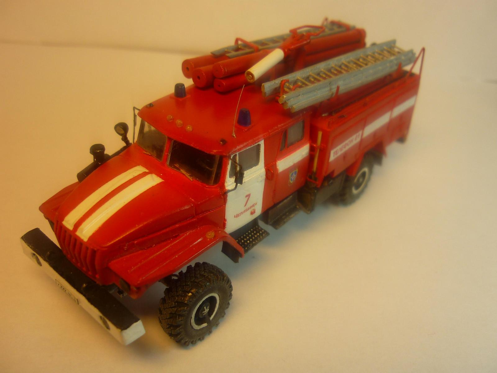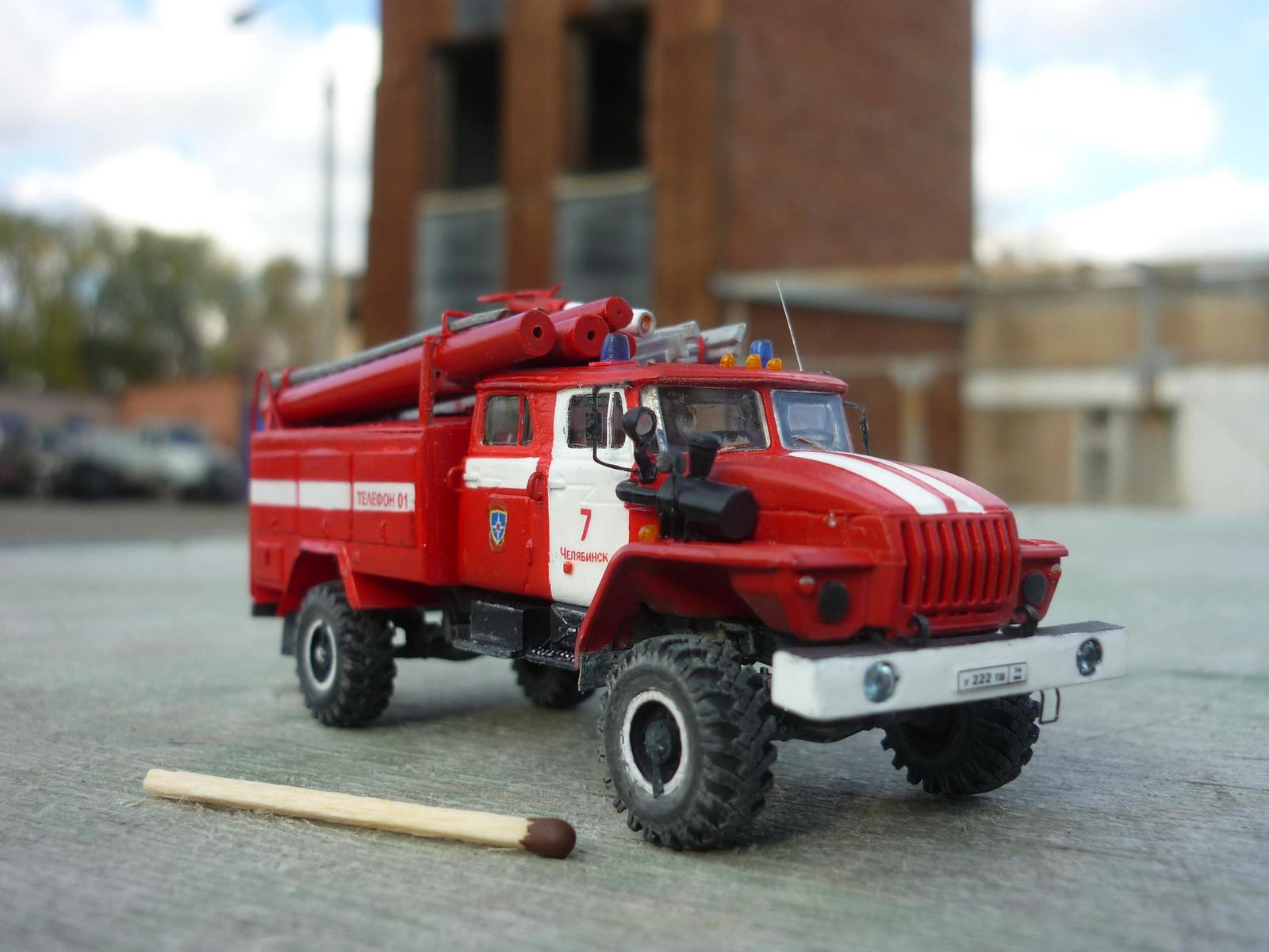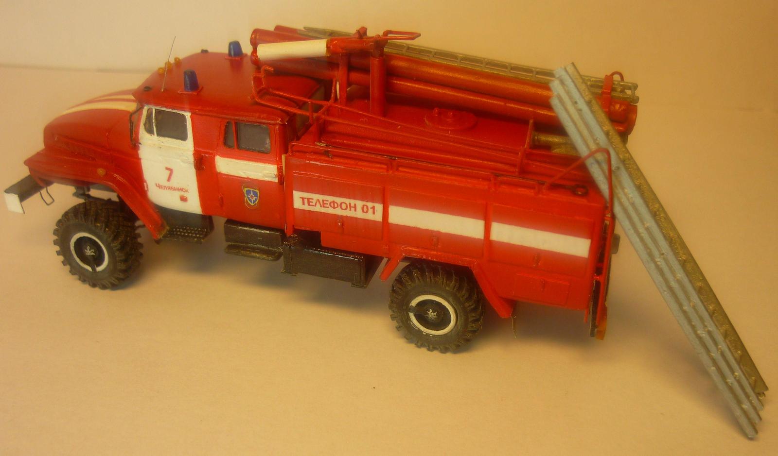 Здравствуйте Коллеги. Представляю вашему вниманию свой долгострой и самодел в одном флаконе. Сразу хочу поблагодарить Михаила Успенского за помощь в приобретении колёс для данного аппарата. А также Марата Назмеева за вдохновение почерпнутое от созерцания его работ. Итак: глубокая конверсия ICMовского Урала 4320 в 72. От штатного набора использовались трансмиссия и две кабины. Колёса "Танкоград". Всё остальное самодел. В ход пошли: различный пластик, начиная от коробок DVD и Доширака и кончая грохотками от яиц. Плюс проволока различного диаметра, бумага и тонкая медная фольга. Покраска "Акан"-акрил и лак того же разлива. Декали заказные. Это попытка сделать автомобиль АЦ 3,0-40(Урал-43206) Урало-сибирской пожарно-технической компанией в г.Миассе Челябинской обл. и стоящий на вооружении моей родной пожарной части №7 г.Челябинска.На первой фотографии оригинал. Что из этого получилось судить вам.