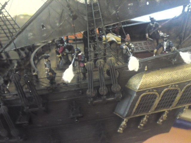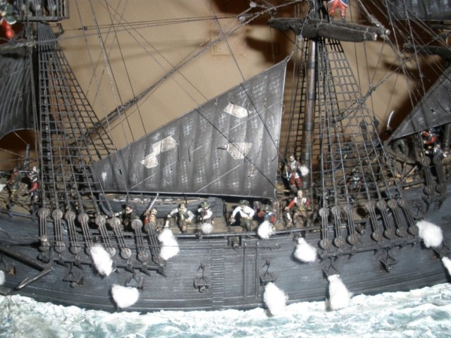 Здравствуйте! т.к я собирал аналогичную модель то к ним у меня повышенный интерес. Корабль понравился! Минуса... да без них ни как, вопрос в другом! как все это смотрится в общем плане! А смотрится Отлично! Меня улыбнула ВАТА! Очень необычно! Хоть многие пишут она не к месту зато до этого додумались только ВЫ! И на фоне воды с пиратами и пушечными залпами ... ну на 5+! (выта к месту в данной композиции)