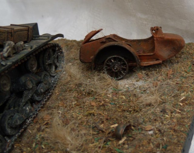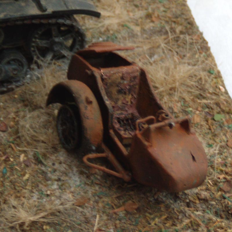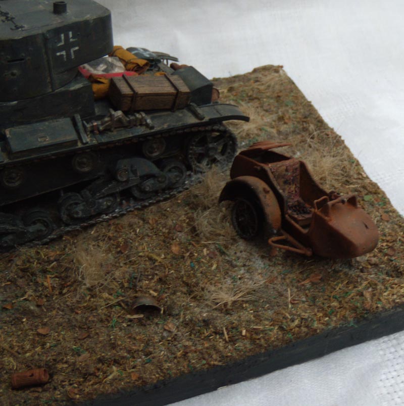 Не совсем понятно время данной виньетки. Судя по газбаку и остаточной коляске от мотоцикла - после войны прошло лет 15-20 и этот танк забыли в какой то глуши.