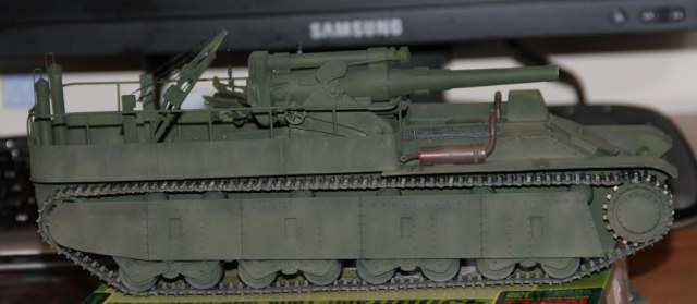 Ух ты, впечатляет запил! Но...смотрится все очень однотонно и плоско, модуляция не спасает. Смысл тогда выставлять незавершенную модель? Очевидно что не хватает смывки, пыли, потертости гусениц, тонировки. Блестючий глушитель не понравился. Мое мнение - на доделку этого монстра