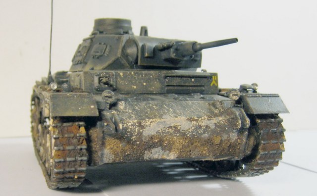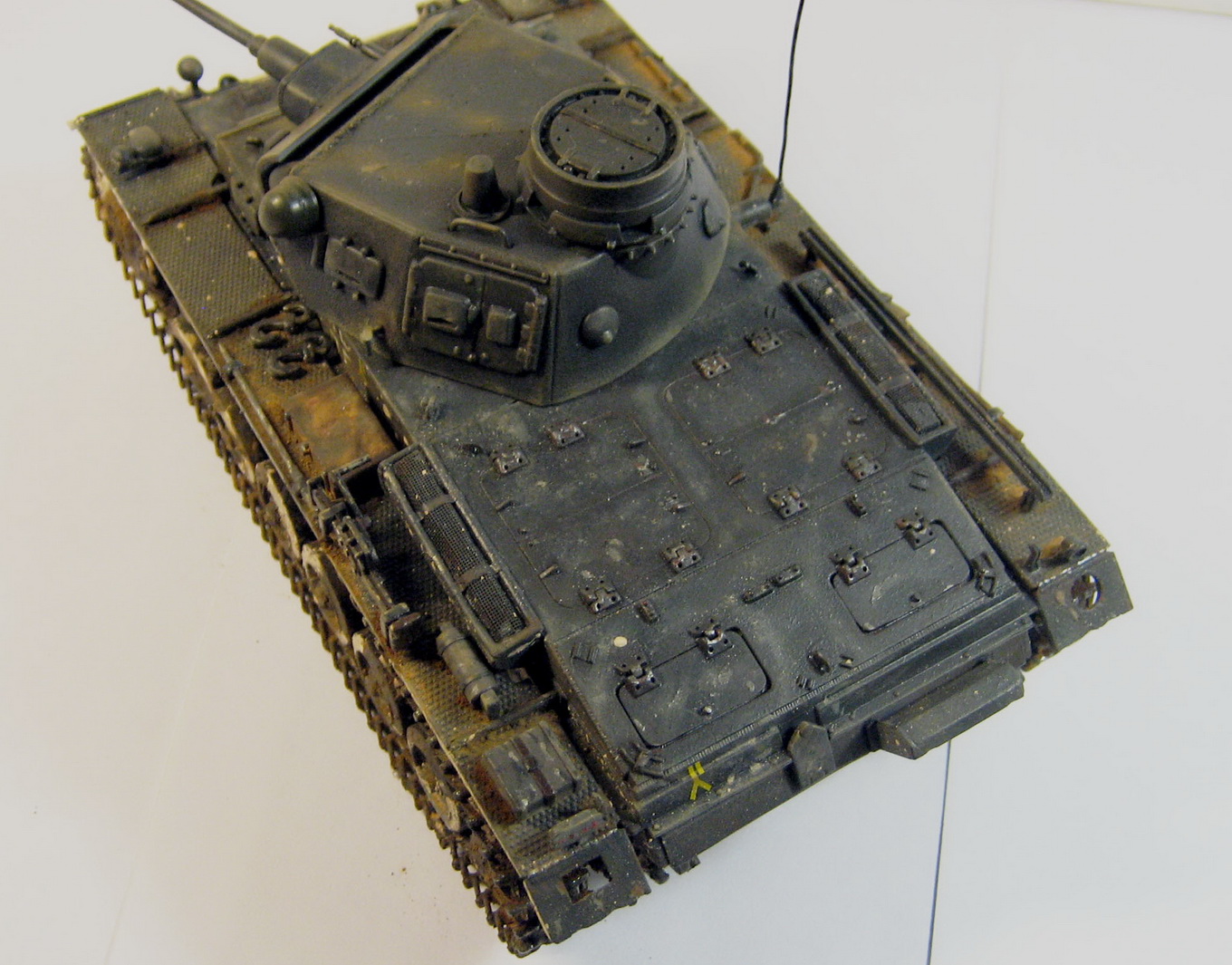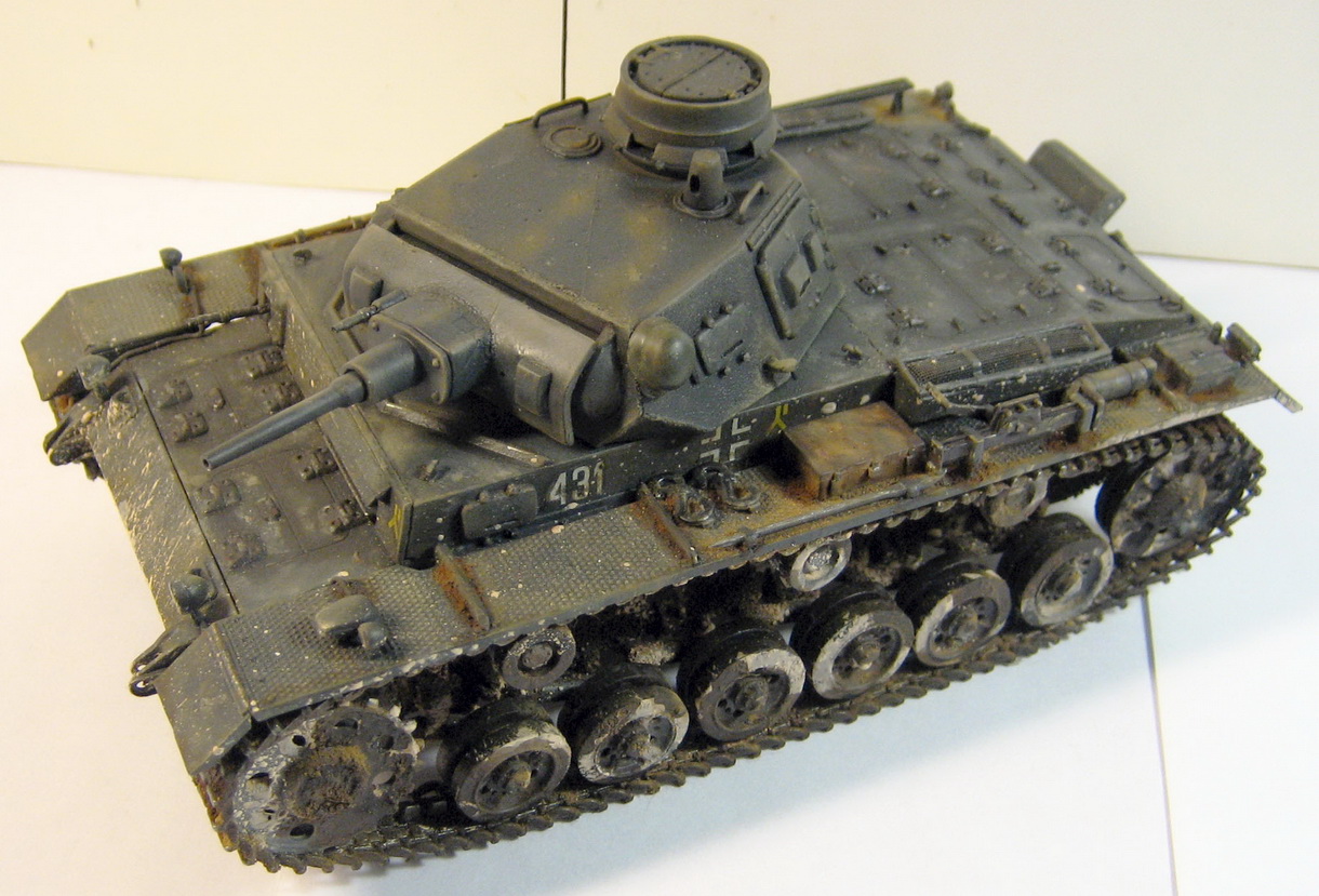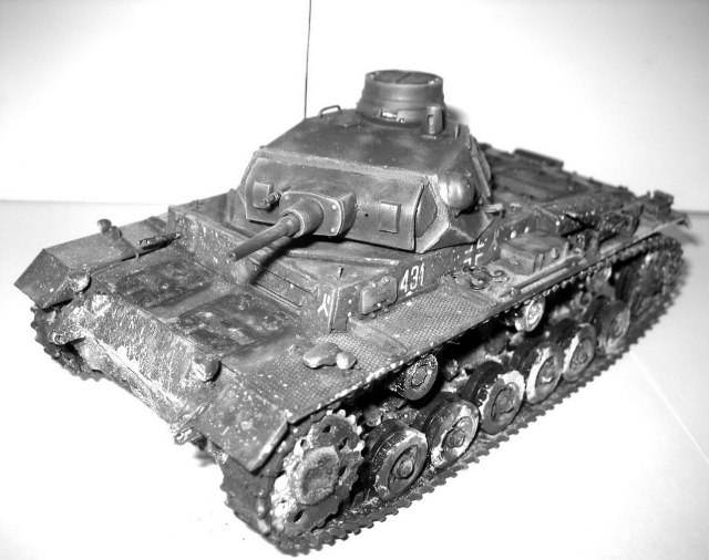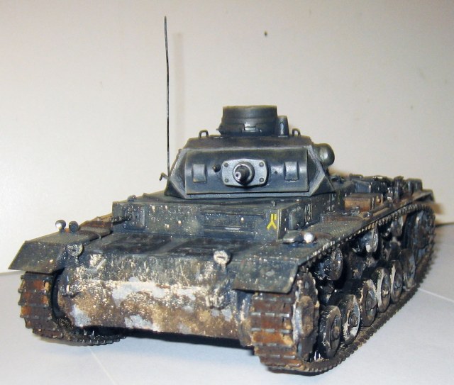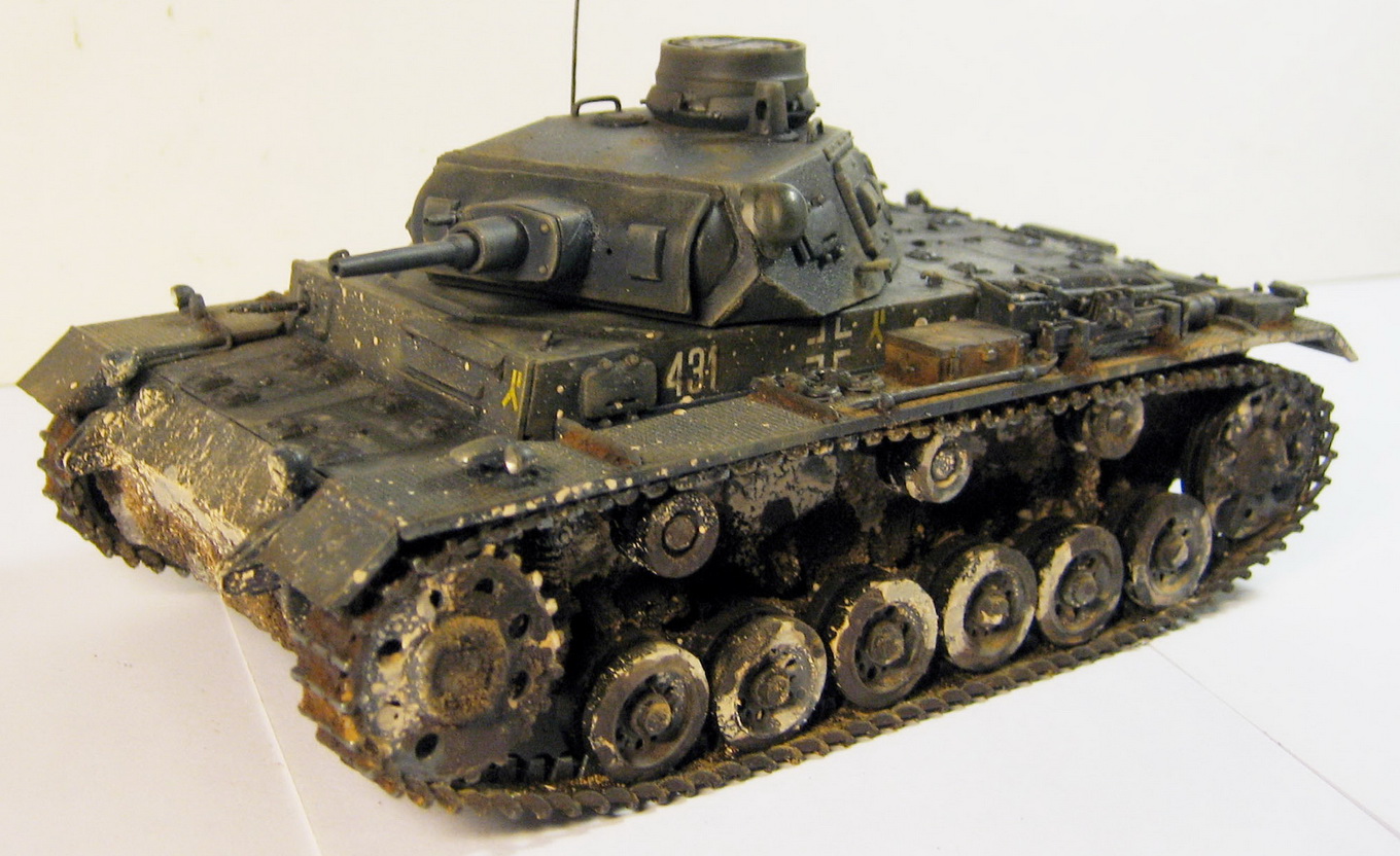 Сборка вся из коробки. Из доработок добавлены швы на башне да кое, где мелкие детали. Ствол пушки Aber, курсовой и спаренный пулемёты Modelpoint. Честно скажу, модель не очень понравилась, геометрия слабая, утяжины не чёткий рельеф достаточно много следов толкателей, пару раз хотел забросить её подальше, но всё, таки дожал. Хотелось сделать тройку, побывавшую под Москвой в 1941 году, а история прототипа гласит, что танки именно 2й дивизии докатились почти до Химок, в том числе и тройки. Окрас база Акан, фильтры MIG,тени Tamiyaи пастель, грязь гипс окрас грязи MIGфиксатор лак Акан. Вот, пожалуй, и всё, стволы пулемётов немного выдвинуты, жаль было такую красоту прятать. За ранее спасибо за уделённое внимание.
