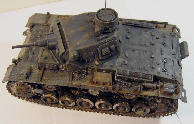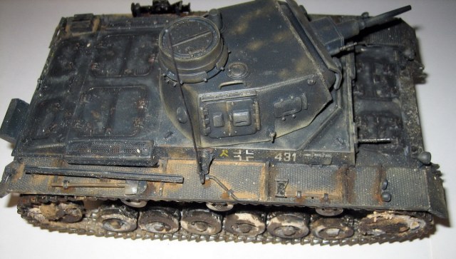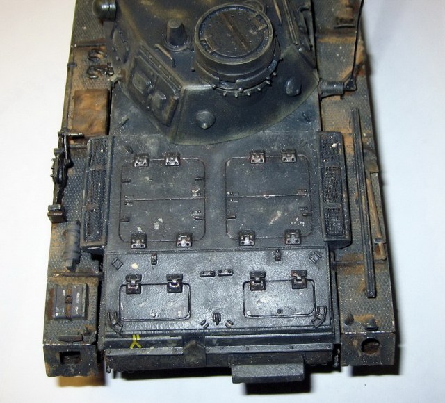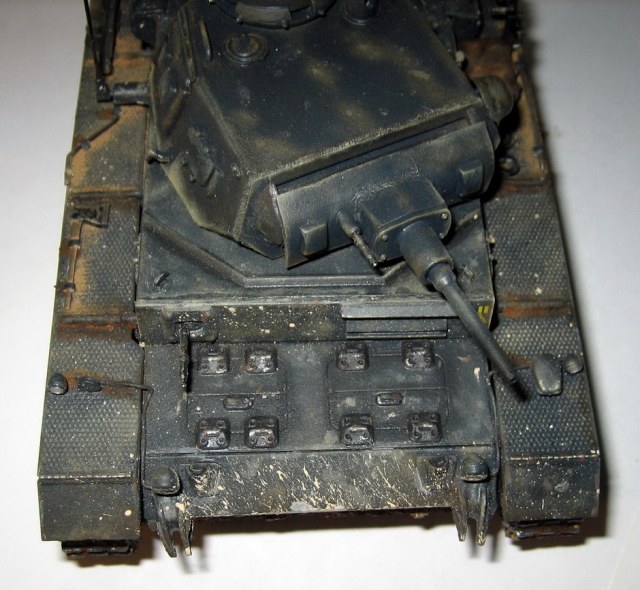 В целом, неплохо. Портит вид некоторая глянцевость на фото. И не совсем продумано нанесение грязи: сильно запыленные полки по центру корпуса, отсутствие пыли впереди на полках, мало пыли сзади на полках, башня припылена, а на МТО практически пыли нет. Когда танк идет на скорости хотя бы 20-25 км/ч сзади из-под гусениц пыль и земля летит чуть ли не на высоту корпуса, соответственно, все это осаждается, в основном, на корме.