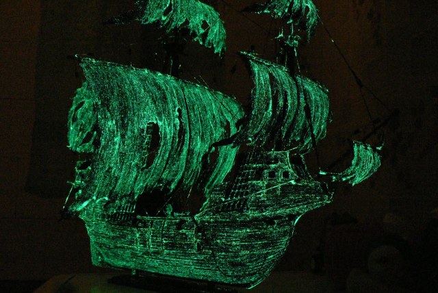 вы совершенно правы. при окраске модели, начитавшись отзывов о звездовской краске с люминофором понадеялся на пресловутый "белесый налет", по крайней мере на фотографиях он был достаточно ощутимым и, на мой взгляд придавал нужную степень старения. на практике оказалось, что порошок после засыхания краски не так уж сильно виден днем.возможно на тех фотах при покраске использовали двойную дозу порошка. получилось, что призраком корабль становится в темноте, в принципе ночное фото это хорошо показывает. а днем это Сан Габриэль с драными парусами.