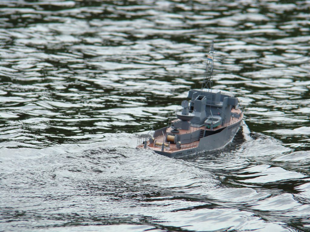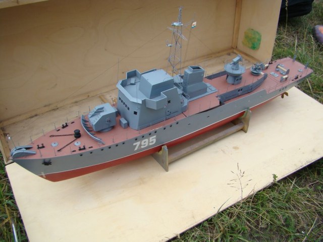 Корпус модели изготовлен из стеклоткани и выклеен матрице, палуба изготовлена была из фанеры прошпаклёванной эпоксидной смолой, надстройки и носовая артустановка изготовлены из досок для лепки.