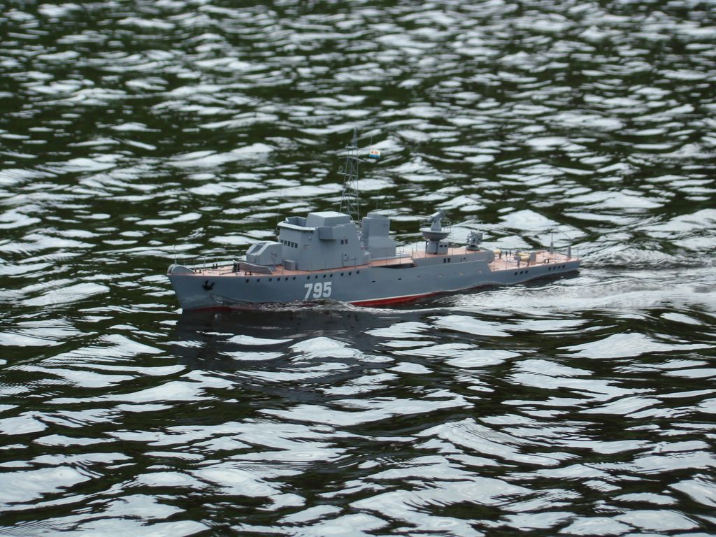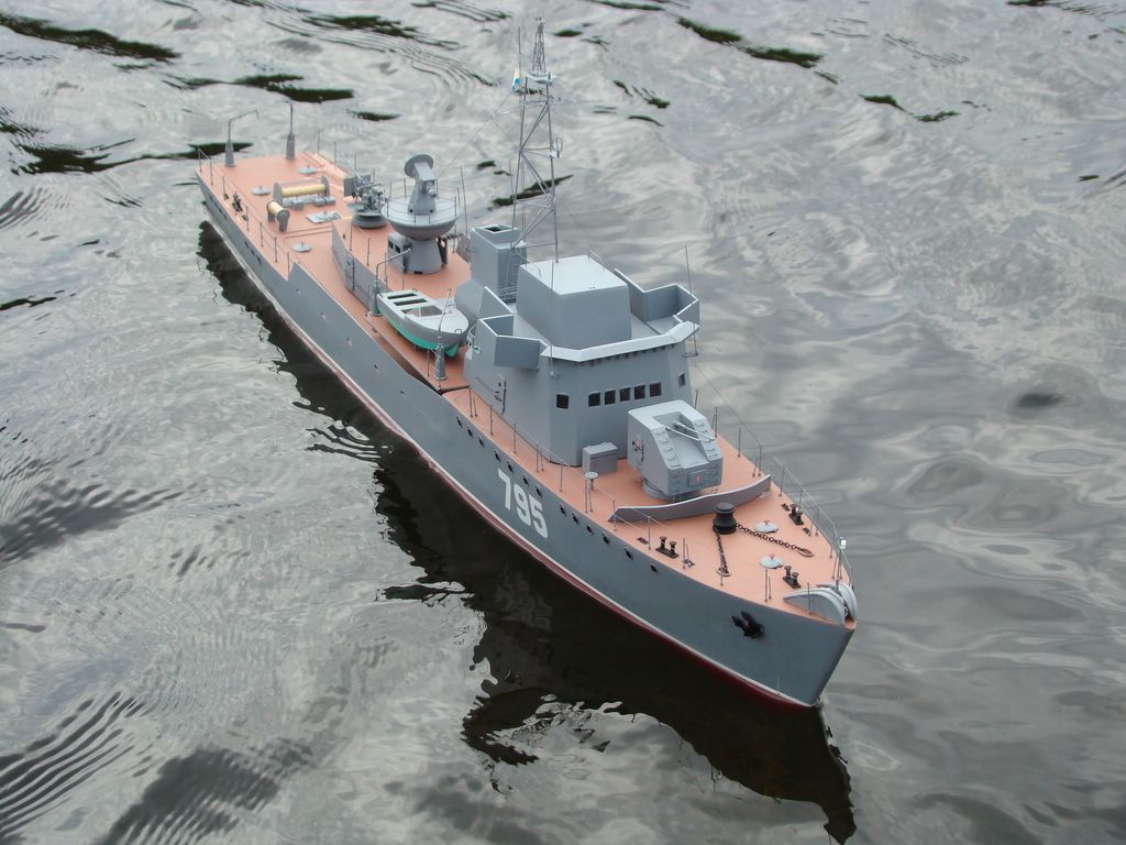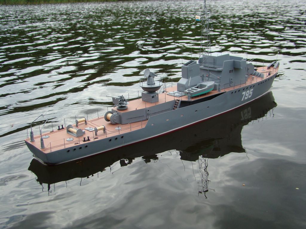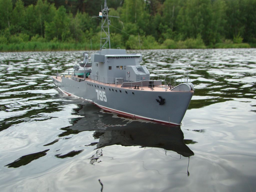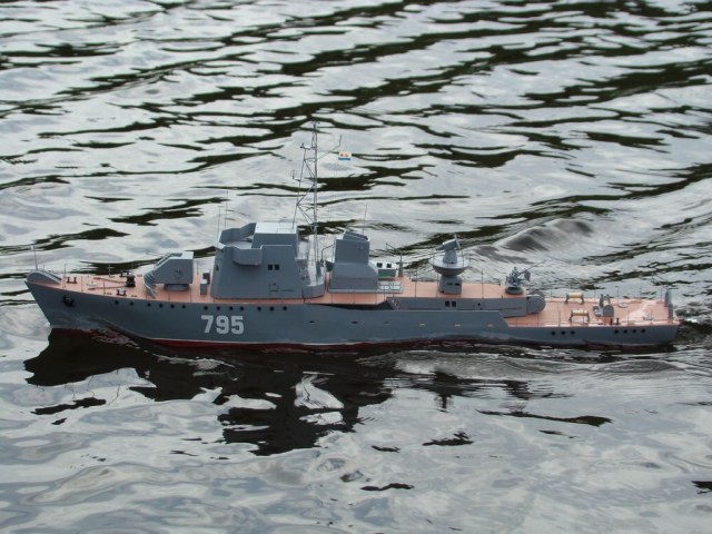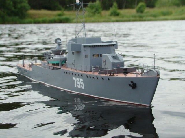 Данная модель строилась мною, когда я был вашим сверстником, она достаточно проста, так как имеет относительно простой корпус. И так, теперь больше конкретики: корпус изготовлен из стеклоткани, предворительно был изготовленна матрица и в ней был выклеен корпус, палуба из 2-3 мм фанеры, надстройки изготавливались из полистирола( можно применять доски для лепки, пластиковые). Внутри стоят два коллекторных мотора, аккамулятор, регулятор хода, приемник, сервомашинка. Рули в действие приводят тяги подключенные к сервомашинке. Винты крутятся благодоря моторам подключенным через мувту к валу. Вал находится в дейдвуде( трубка такая), который имеет с двух концов втулки. Извини, что применил много судомодельных терминов, я думаю, что ты сможешь разобраться. В любом случае если будут возникать вопросы во время постройки, спрашивай, с радостью отвечу!