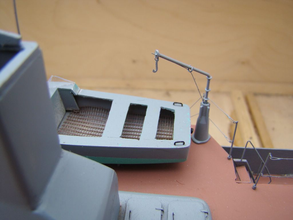 Содрал всю краску с корпуса, разобрал надстройки, заменил всю ходовую часть модели, зашпаклевал все незашпаклёванные раковины на корпусе, заново зашпаклевал палубу, заменил носовую и кормовую артустановки, заново собрал надстройки, изготовил леерное ограждение «с колечками», изготовил новую мачту. Было ещё много доработок по мелочам, но о них рассказывать не буду.