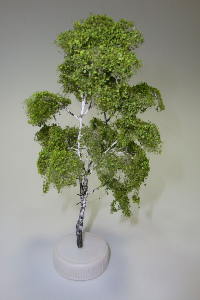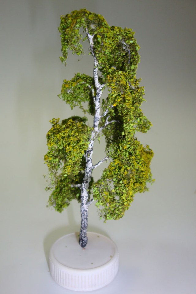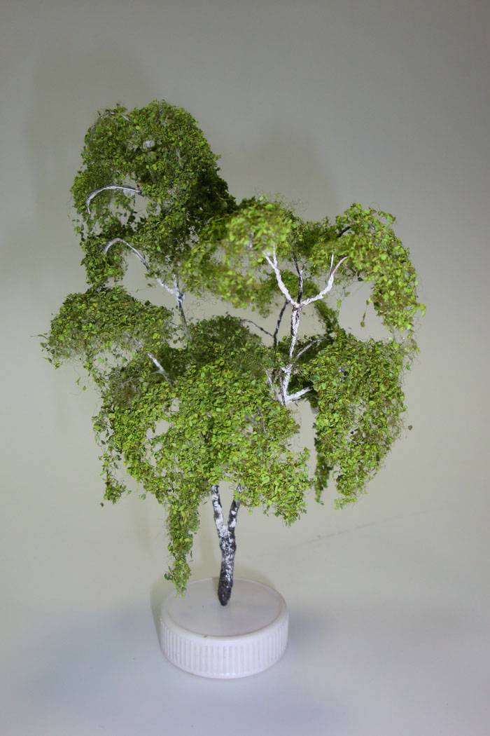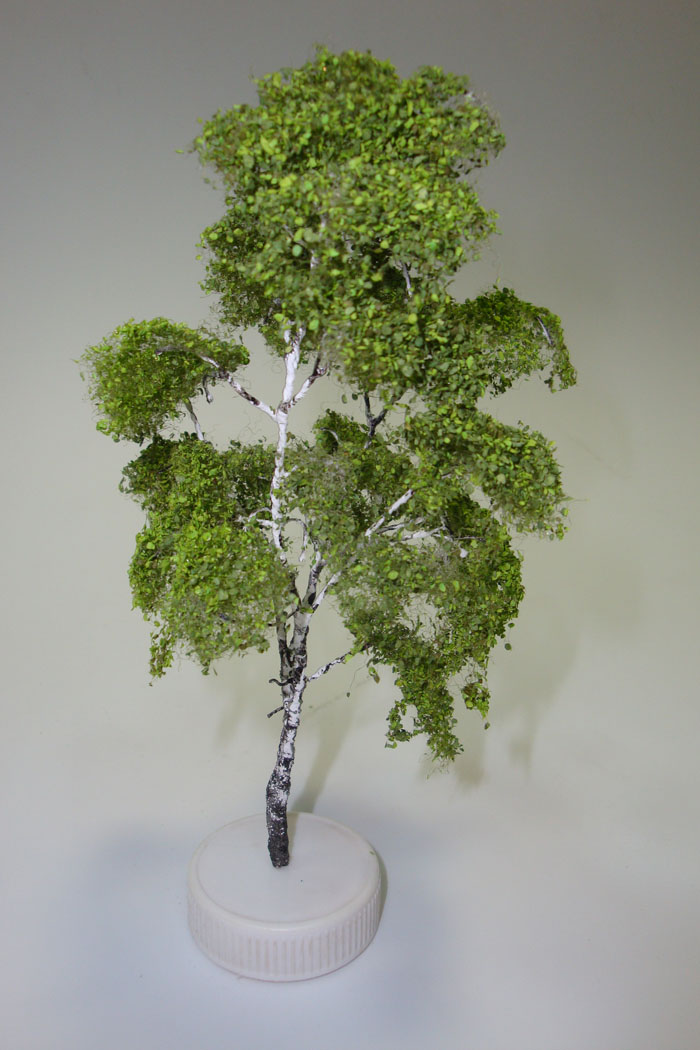 Листики это ноховская присыпка.каркас проволока 0.3мм ,после того как сплел каркас обмазал его пва и сверху обсыпал опилками ,опилки в виде пыли,потом положил в духовку чтоб не ждать когда высохнет пва.после низ ствола еще раз промазал и обсыпал опилками крупнее ,ствол в этой части грубее,высушил в духовке .потом окрасил белой краской ствол и ветки .сушим.работаю кистью и акрилом ,далее черный цвет ,полоски наносим сухой кистью .самые тонкие веточки тоже можно затонировать в черный.далее сверху клеим ворс NOCH 95750 ,после с помощью спрея на ворс приклеиваем присыпку "типа листики" тоже NOCH артикул не помню,я брал набор из нескольких цветов.думаю что сверху можно дунуть лаком полуматовым -у березы листья блестят(глянцевые).