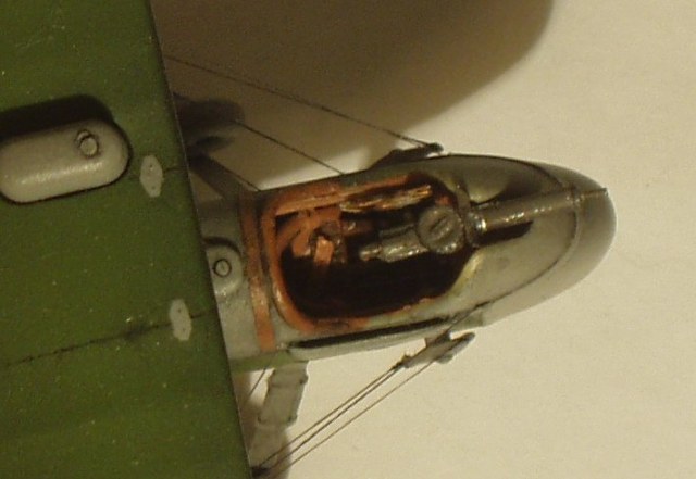 На самом деле собрано и окрашено очень даже качественно, но к сожалению по матчасти есть огрехи. Бак по центру, а не справа, непонятные нашлепки в местах крепления фермы к крыльям, нет фирменных зубцов 24-го sq. на днище гондолы... И совсем не похожа на себя мелочевка - пулемет, тот же бак, боксы для патронных дисков, шины толстоваты. Движок плохо видно, но похоже он тоже из набора.