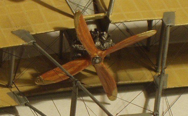 В свою очередь, мне пришлось полностью изготовить кокпит, в связи с полным отсутствием оного в наборе, двигатель из набора был взят за основу и доработан (или переделан), винт переделан из пары старых( из запасов). Также были переделаны узлы крепления балок хвостовой фермы, гондола ,руль поворота, сопряжение нижнего крыла с гондолой. А так-же добавлены различные трубки,горловины,ролики и т.д.