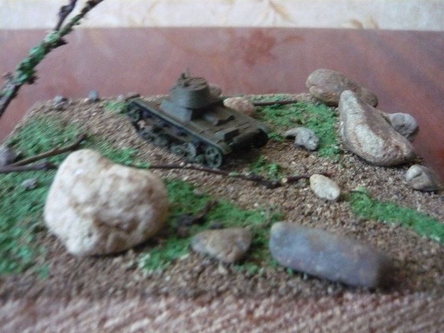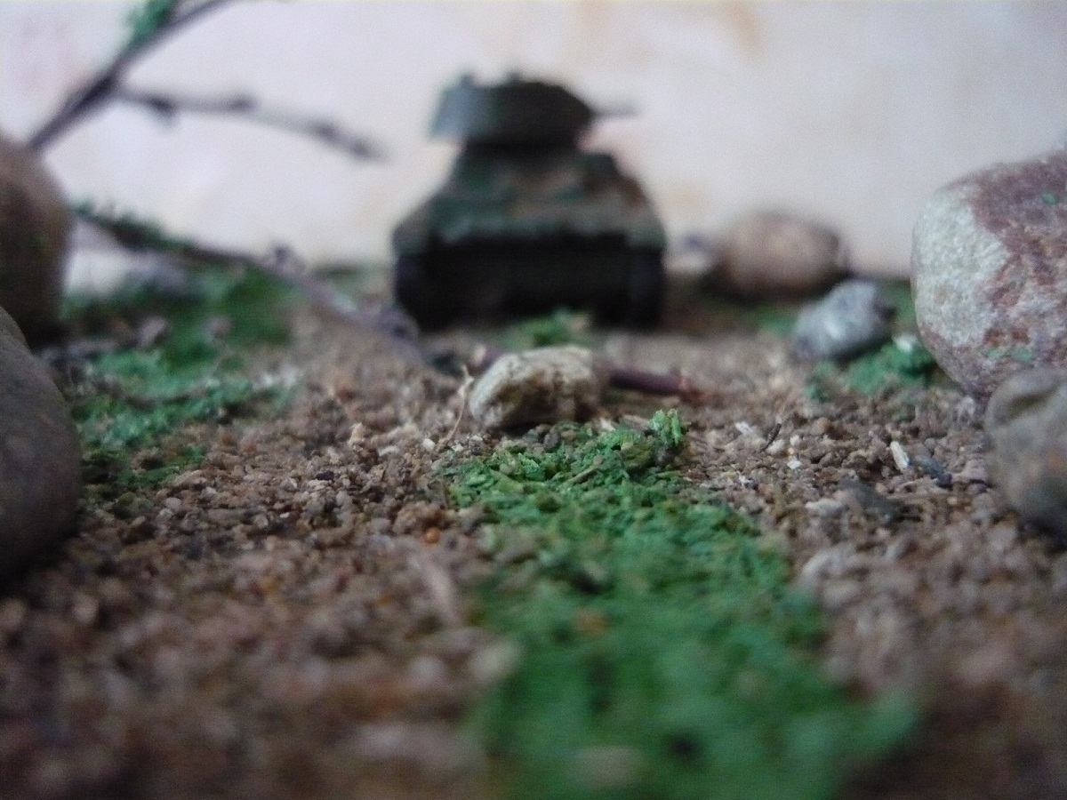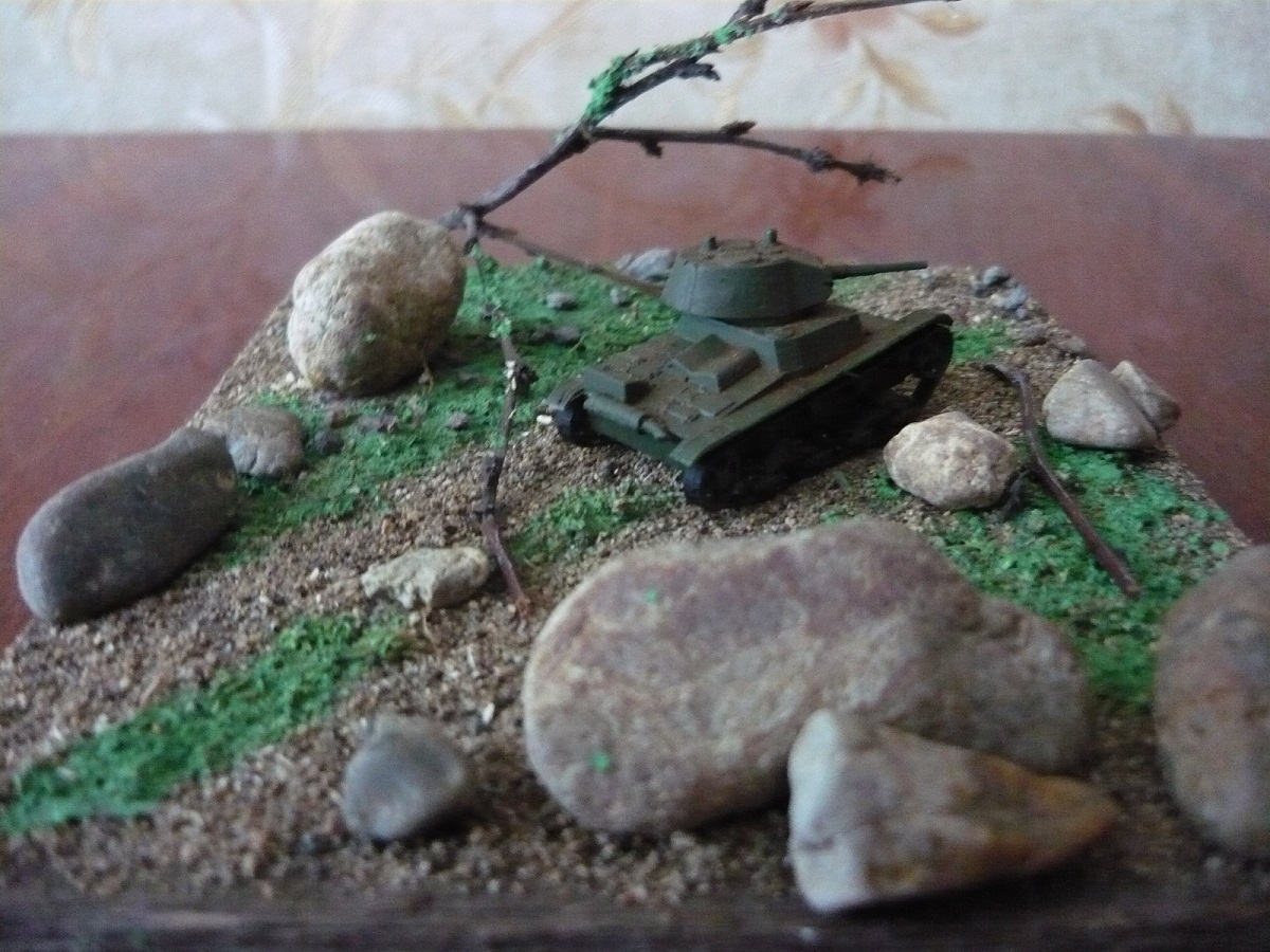 Михаил! Камни в таком представлении не похожи на валуны реальные в природе. Небольшие веточки деревьев не похожи на настоящие деревья и кусты. Грунт реальный не похож на грунт в масштабе. Это все надо видоизменять...Ну, трава - с натягом, если бы не остальные природные материалы - потянет. Танк - ... пусть моделисты бронетехники обьяснят. Сюжет? Композиция? ... Подставка... Фон... Не, ладно, главный минус - это непеределанные природные материалы!!!