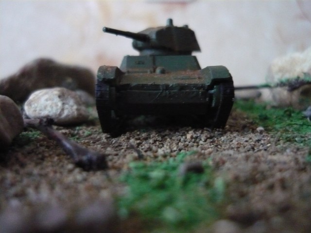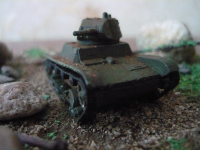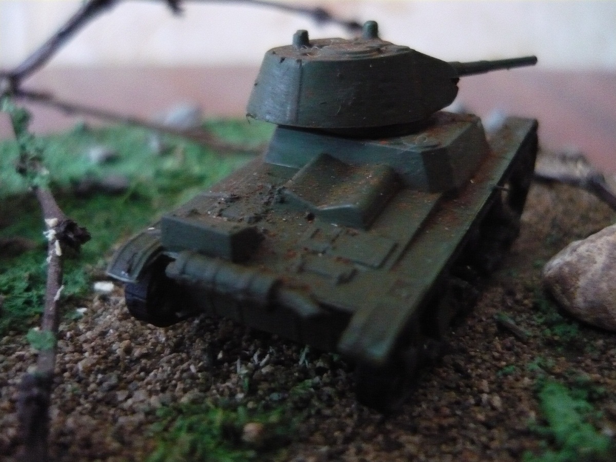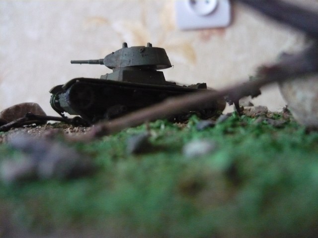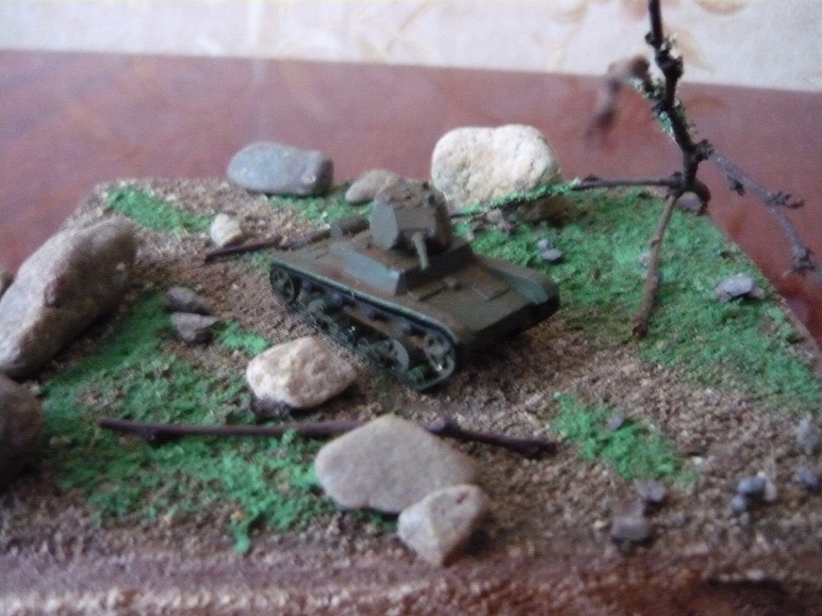 Решил выставить мою первую диораму.Всё началось с того , что надо было сделать подарок отцу ко дню рождения. Два года назад я во Владивостоке купил журнал с моделью танка т-26. Как ни странно модель фирмы Звезда. Приехав домой я собрал её (а собирается она без клея) и поставил на полку. Стояла она несколько лет и вот решил сделать диораму.