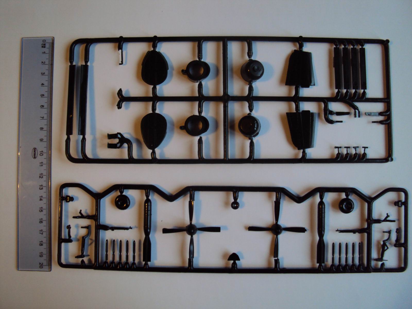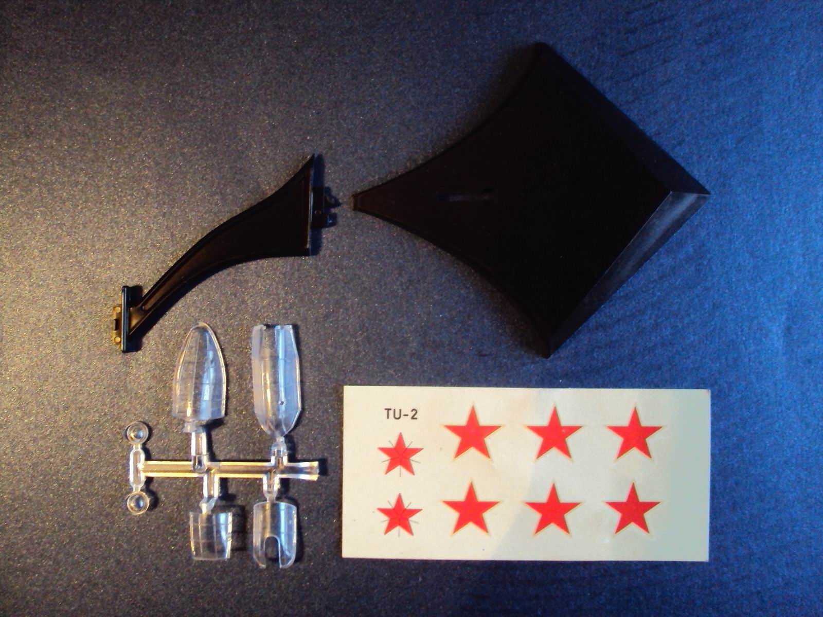 В этом комплекте основные детали выполнены из темно-зеленого пластика, один литник черного цвета, комплект стекления фонаря, подставка черного цвета, схема инструкция на трех языках, декали звезды.