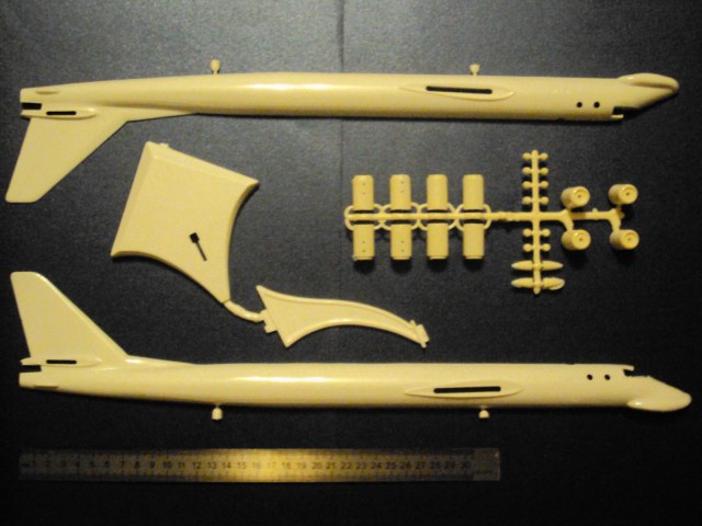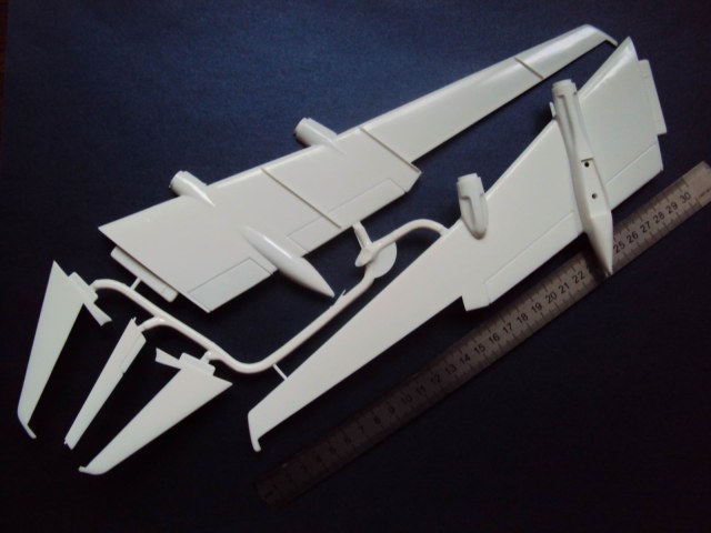В комплекте семь литников пластик белый глянец, черный, серебристый, прозрачный, инструкция достаточно простая но понятна - на русском, немецком, чешском, польском; декали звезды. Одна из больших по размерам моделей этого производителя, длина около 45 см по плоскостям до 60 см.