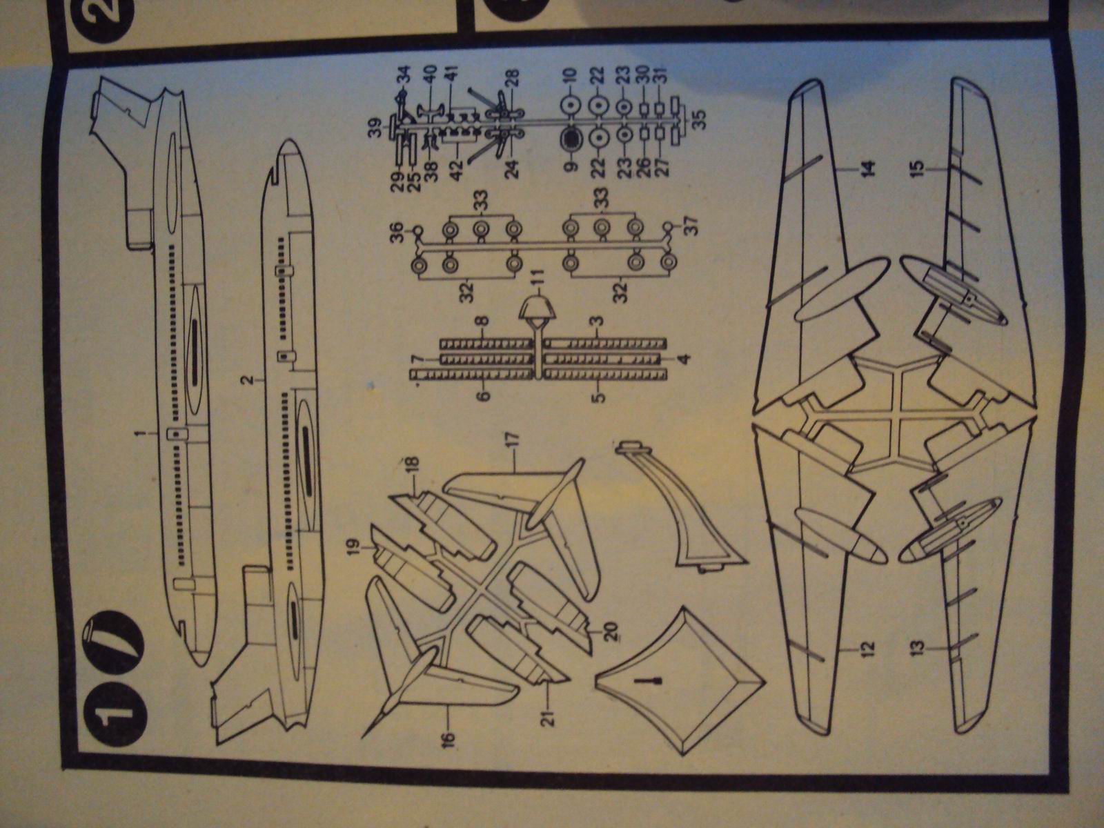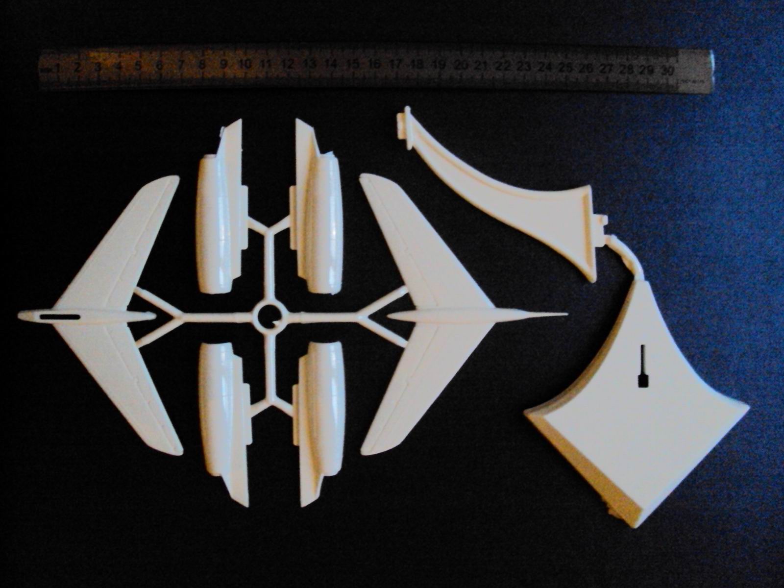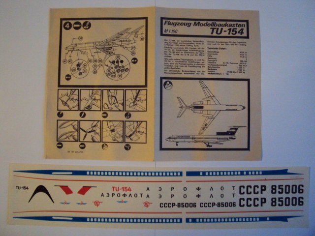 Самый распространенный и знакомый нам аппарат. Модель крупная, длина до 45 см. Набор стандартный, литники в трех цветах - белый глянец, черный, серебристый и прозрачное остекление, подставка. Подробная, пошаговая инструкция - схема. Деки - Аэрофлот СССР, клей (и тут испарился).