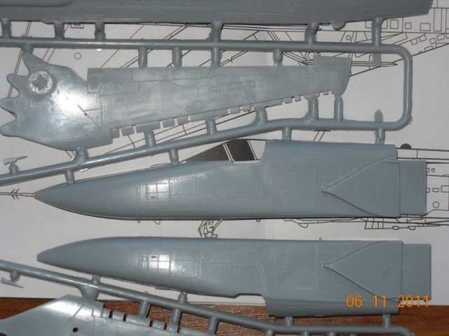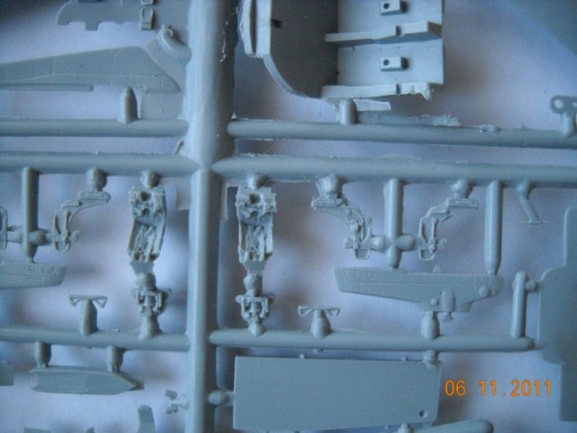 Литники с деталями нормального качества, облой присутствует, но не в критичном количестве. На внешней обшивке присутствует очень тонко и красиво выполненная расшивка (в основном правильная) и клепка, хотя для многих это не проблема сделать самому. Некоторые мелочи отличаются неплохой деталировкой: стойки шасси, ремни на креслах. Всю механизацию крыла набор позволяет сделать подвижной, а также самостоятельно поворачивающиеся пилоны на крыльях при изменении стреловидности!!! Фонарь также предложенно сделать открывающимся или глухо закрытымя. хотя качество его на мой взгляд не очень, я буду использовать звездовский.