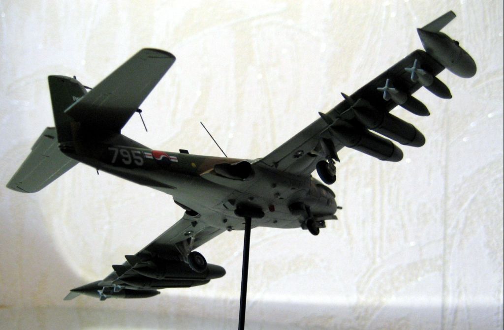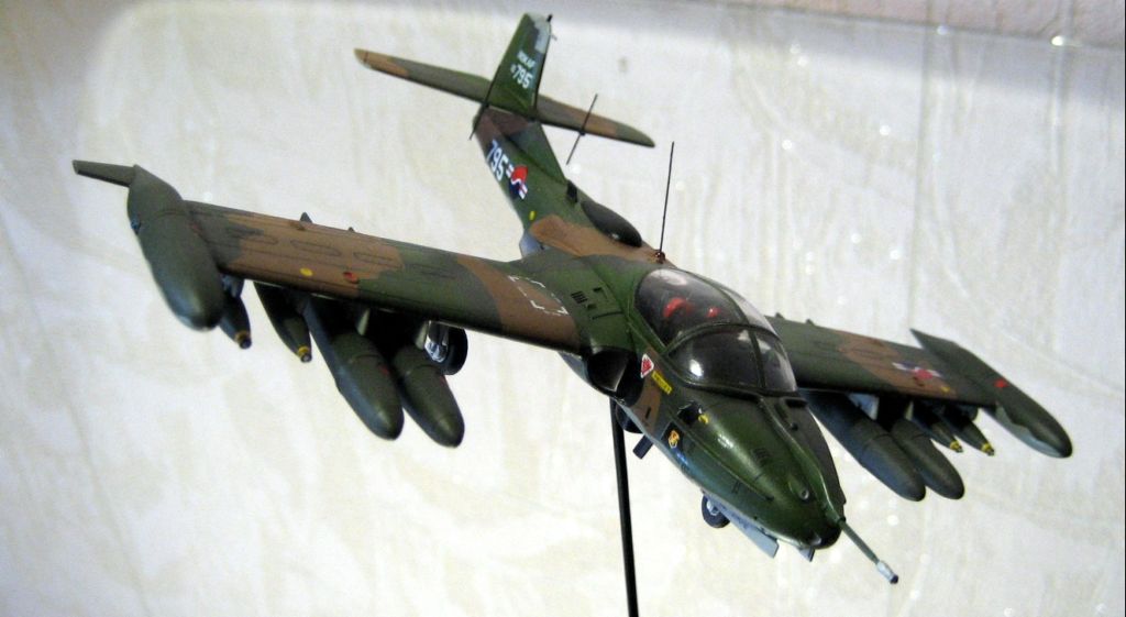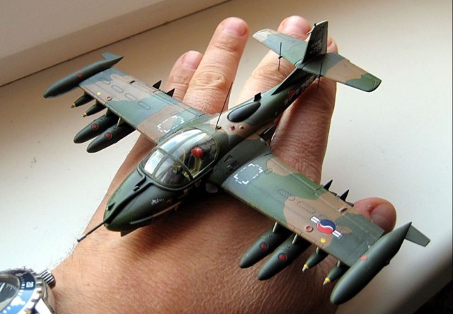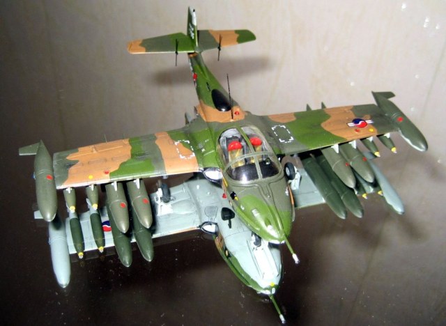 Приветствую всех корпчан.Хочу дебютировать на вашем сайте с модель достаточно редкой . Ну не недолюбливает почему то наш брат моделист это самолет. А зря. Впервые о существовании этого Л.А. автор узнал , из Зарубежного военного обозрения 2№ ,1985г. На низкокачественном фото можно было разглядеть , непривычный , для глаза советского человека силуэт самолета.Было в нем нечто, угрожающе –привлекательное…Сразу понимеш, что добра от встречи с этой стрекозой( Dragonfly - стрекоза) ждать не приходится.В то время истинных размеров и характеристик машины , я не знал.Это сейчас пару кликов мышкой и ву-аля: A-37B Dragonfly - легкий многоцелевой штурмовик, разработанный американской фирмой Cessna Aircraft. В 1970 году компания Cessna построила пробный экземпляр легкого штурмовика специального назначения Cessna Model 318Е, основанный на Т-37. Он совершил первый полет в сентябре 1967 г. После оценочных испытаний в мае 1968г. начались поставки первой партии самолетов А-37В. Конструкция А-37В отличалась от пробной модели YAT-37D тем, что планер был рассчитан на 6-кратные перегрузки, максимальная емкость внутренних топливных баков увеличена до 1920 литров, самолет мог нести четыре дополнительных бака общей емкостью 1516 литров, имелось оборудование для дозаправки в воздухе. Силовая установка состояла из двух турбореактивных двигателей General Electric J85-GE-17A. Самолет был оснащен 7,62-мм пулеметной установкой GAU-2B/A Minigunи восемью подкрыльными узлами наружной подвески, рассчитанными на вооружение различного типа общим весом 2268 кг. Кроме того, А-37В оснащался фотокинопулеметом и фотоаппаратом для оценки поражения. Для защиты экипажа из двух человек вокруг кабины устанавливалась бронезавеса из многослойного нейлона. К моменту прекращения производства в 1967г. всего было построено 577 штурмовиков А-37В. Эти самолеты поставлялись в дружественные США страны. Добавлю , самолёт оснащён катапультными креслами , и реверсом тяги.. Та ещё штучка!