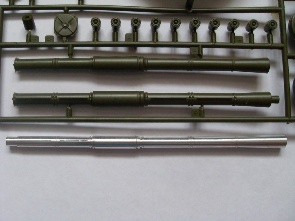 Mоdel Point: дымовые гранатомёты системы "Туча", пустые. В небольшом пакетике их находится 6 штук. Фото приведены в сравнении с аналогичными деталями из Звёздовского набора. От той же фирмы и точёный ствол с теплозащитным кожухом. Ствол дан единой деталью, так же приведены фото в сравнении с пластиковым из набора Звезды.