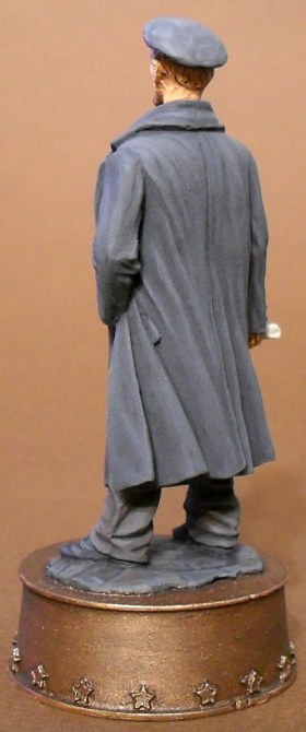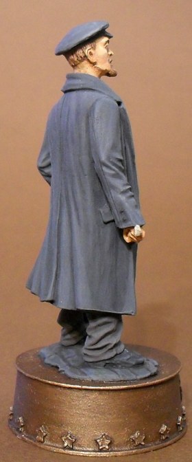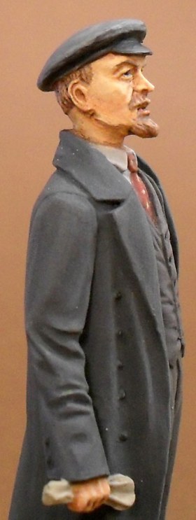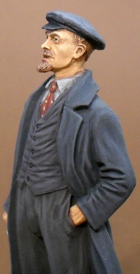 На счёт галстука спорить не буду,хотя на картинах и раскрашенных фото он то синий,то коричневый,то красный,цвет выбран скорее по политическим мотивам а не по историческим.А вот цвет костюма,на тех же картинах,да и фото,то чёрный,то серый,то коричневый и смешения этих цветов,соответственно и у фигурки костюм покрашен в коричневых тонах,а плащ,серый,да фото немного съели разницу,но по моему всё же заметно,к тому же в конце есть другие фото,где это хорошо заметно.Так что с этим не совсем понятно,есть фото и картины где Ленин вообще одет однотонно,так что хотелось бы понять,в чём тут промах?