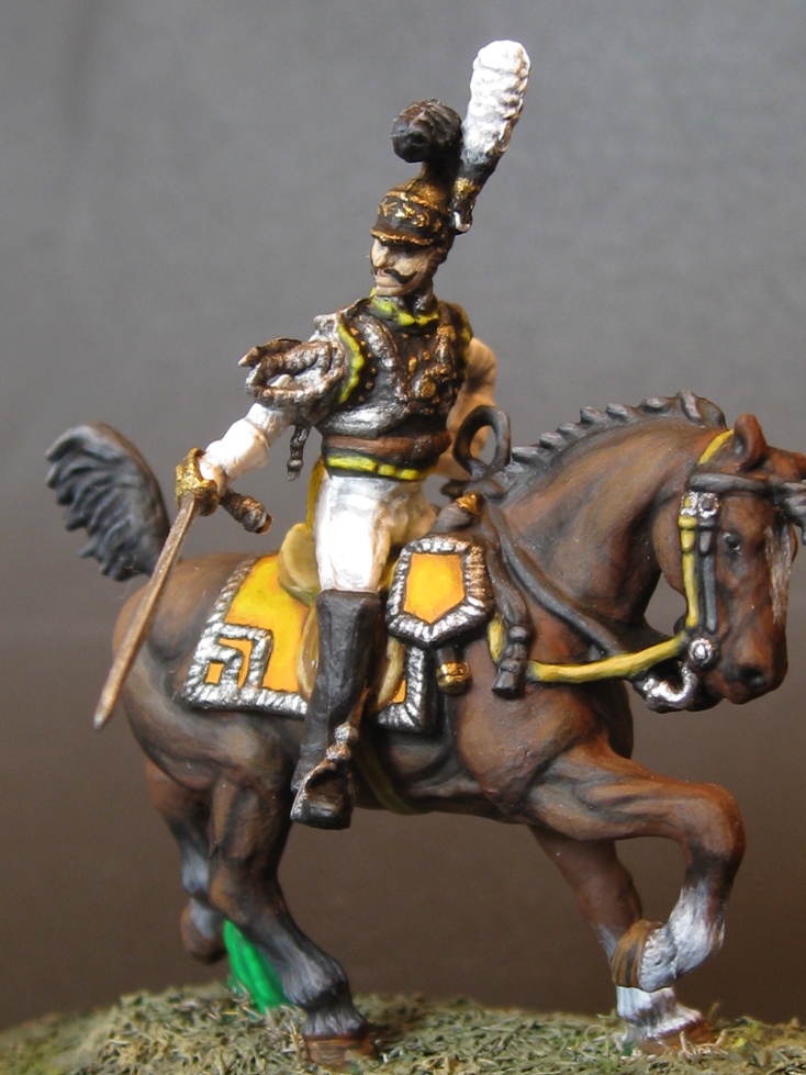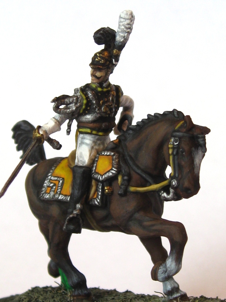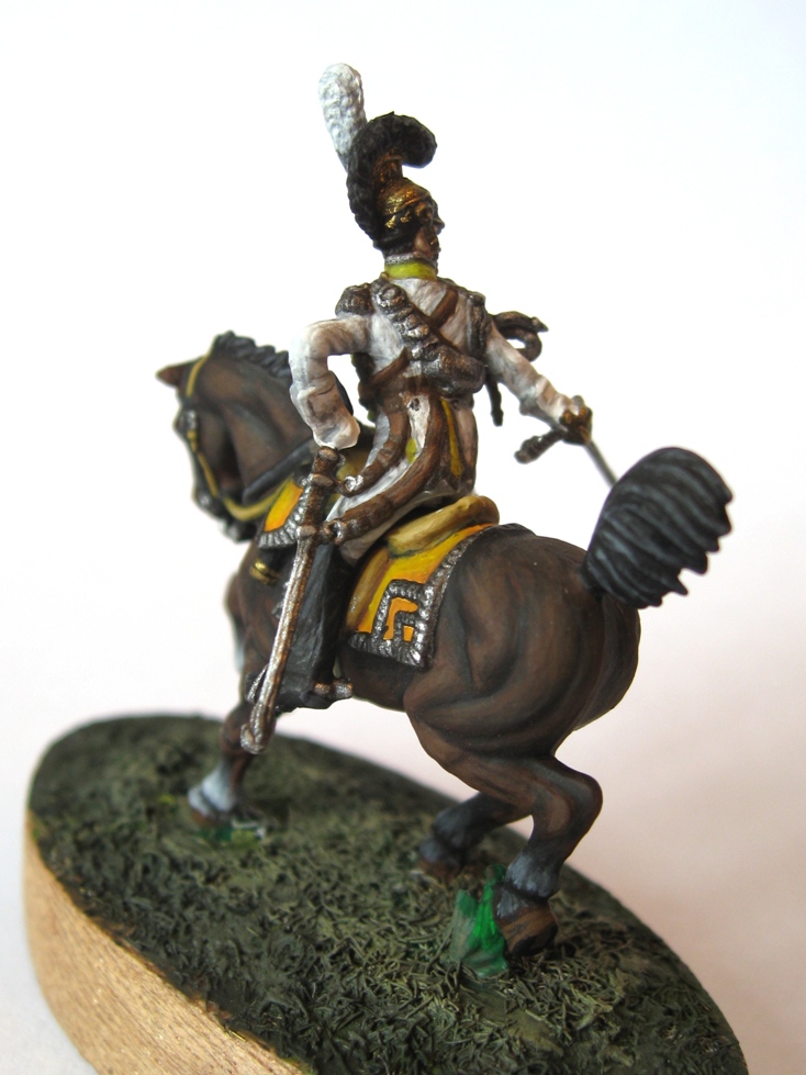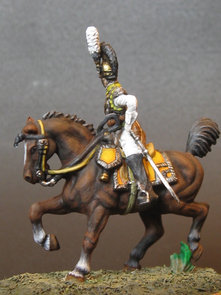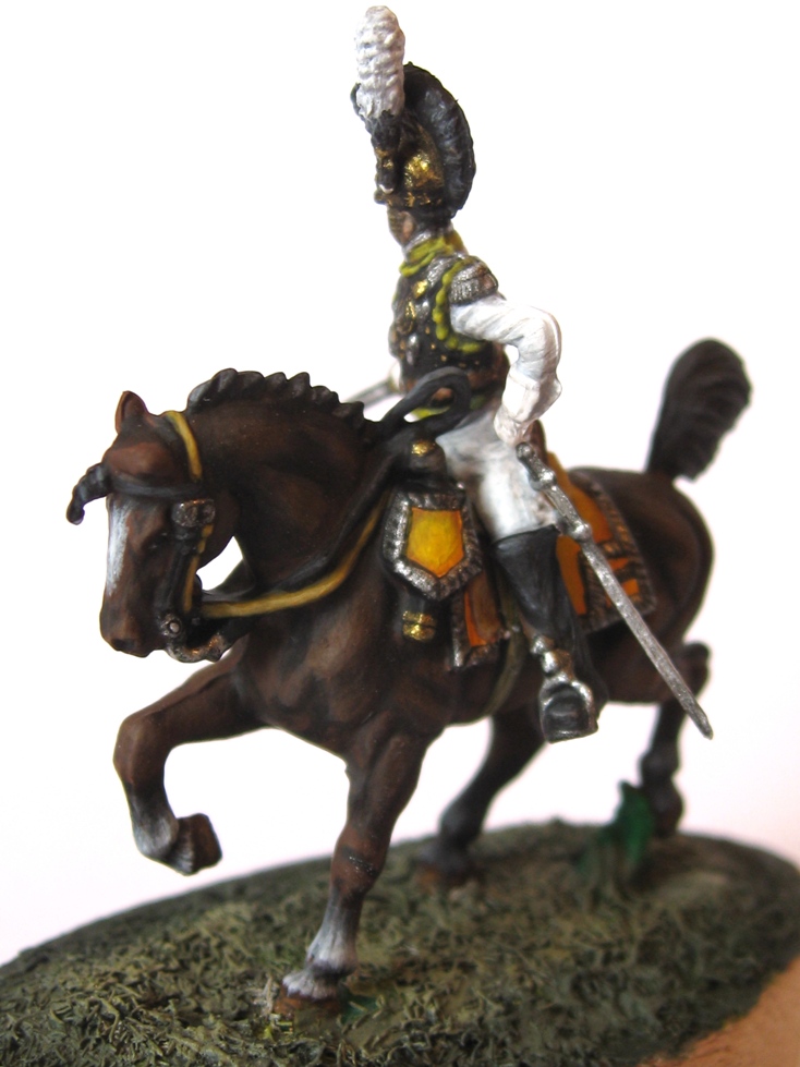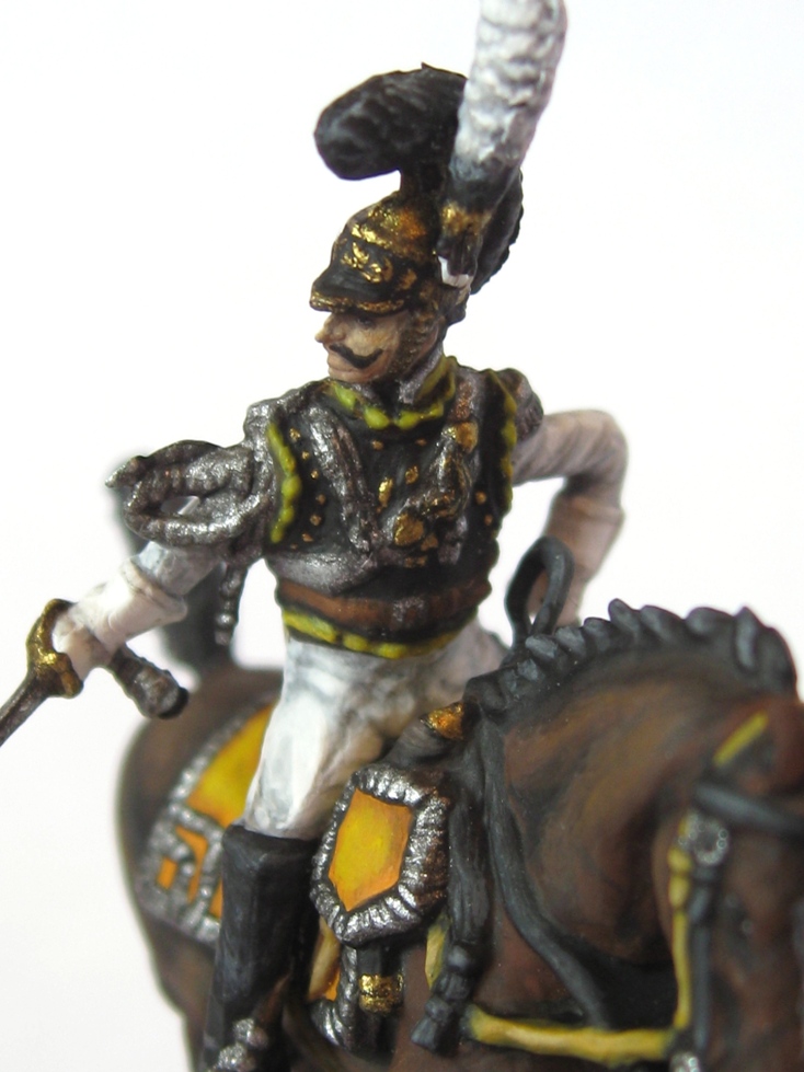 Вообще, если наиболее полно представить саму миниатюру, то перед нами "Обер-лейтенант кирасирского вакантного бывшего Цастрова полка". Совершенно правильно показаны укороченный хвост-отличие офицеров тяжелой кавалерии,да, и двойной прямоугольный галун по вальтрапу соответствует чину. Но вместе с тем в миниатюре странной выглядит сбруя у коня. Возникают правомочные вопросы как все это не спадает с морды и как этим управлять во время боя. И пока для себя ответа не нашел. Хотя изображение с подобным вариантом существует. Некто Опиц совершенно четко изображает это на картине, правда в привязке к другому персонажу - офицеру полка "Гард дю Кор". Правильно ли распространять на полк Цастрова, осталось непонятным. Я рекомендовал бы дорабатывать миниатюру и делать ремни: 1)щечный 2)тот ремень, что морду прихватывает 3) петлю под хвост 4)ремни на груди с пряжкой. Кроме того, есть смысл удалить бушмат, расположеный с правой стороны у лошади.Есть частные мнения, что эта деталь снаряжения не характерна для примененяи офицерским составом.